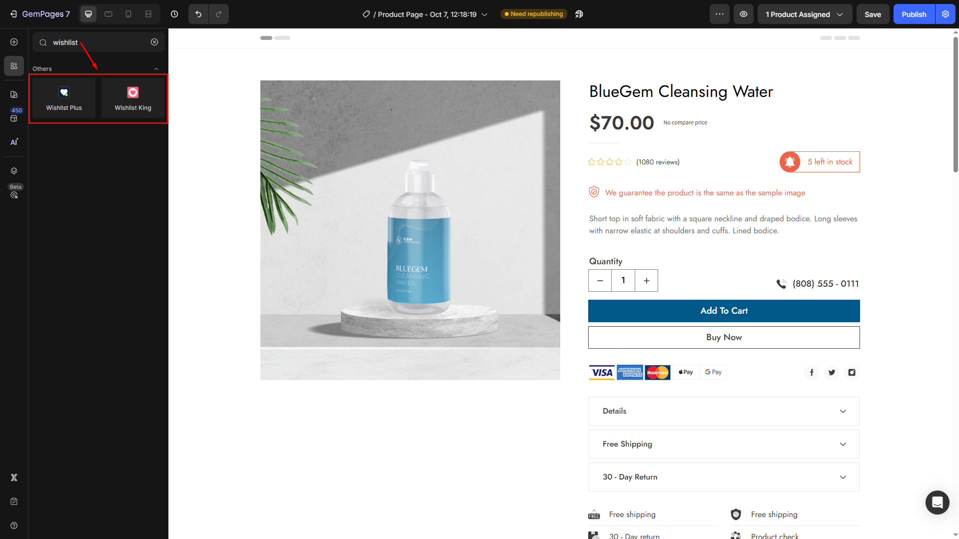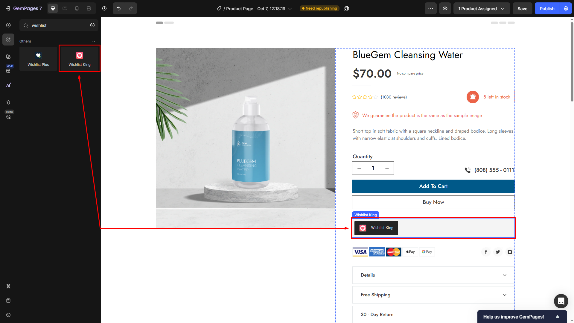 To add a wishlist button, you’ll need to use GemPages in combination with a third-party wishlist app from the Shopify App Store. Follow these steps to integrate the wishlist functionality into your product page.