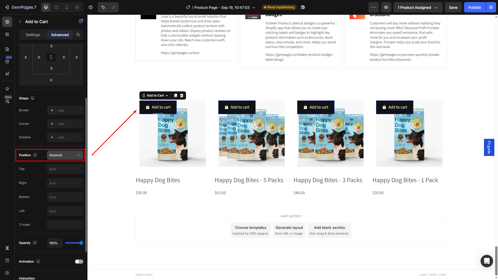 Within GemPages v7, you can design your own product list section with an “Add to Cart” button above the image.