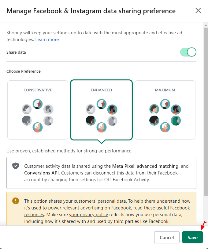 Following that, a window will appear where you can determine the level of data sharing. Simply toggle on the “Share data” option. Then, in the “Choose preference” section, make a selection from Standard, Enhanced, or Maximum. For a detailed understanding of the distinctions between these three levels, refer to this article from Shopify.