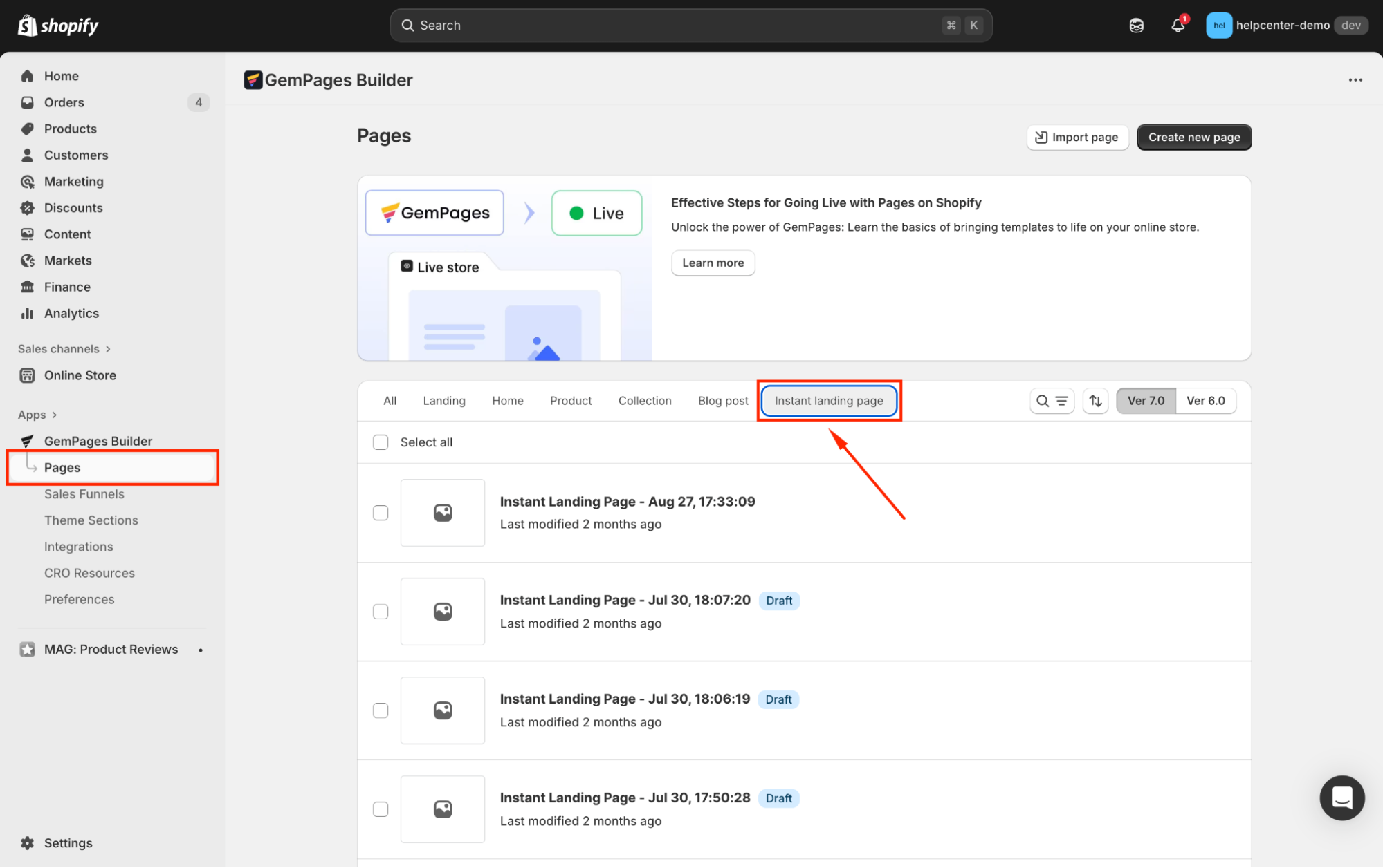 - Go to the GemPages Dashboard > Pages, and select Instant landing page to locate all instant landing pages you’ve built with GemPages.