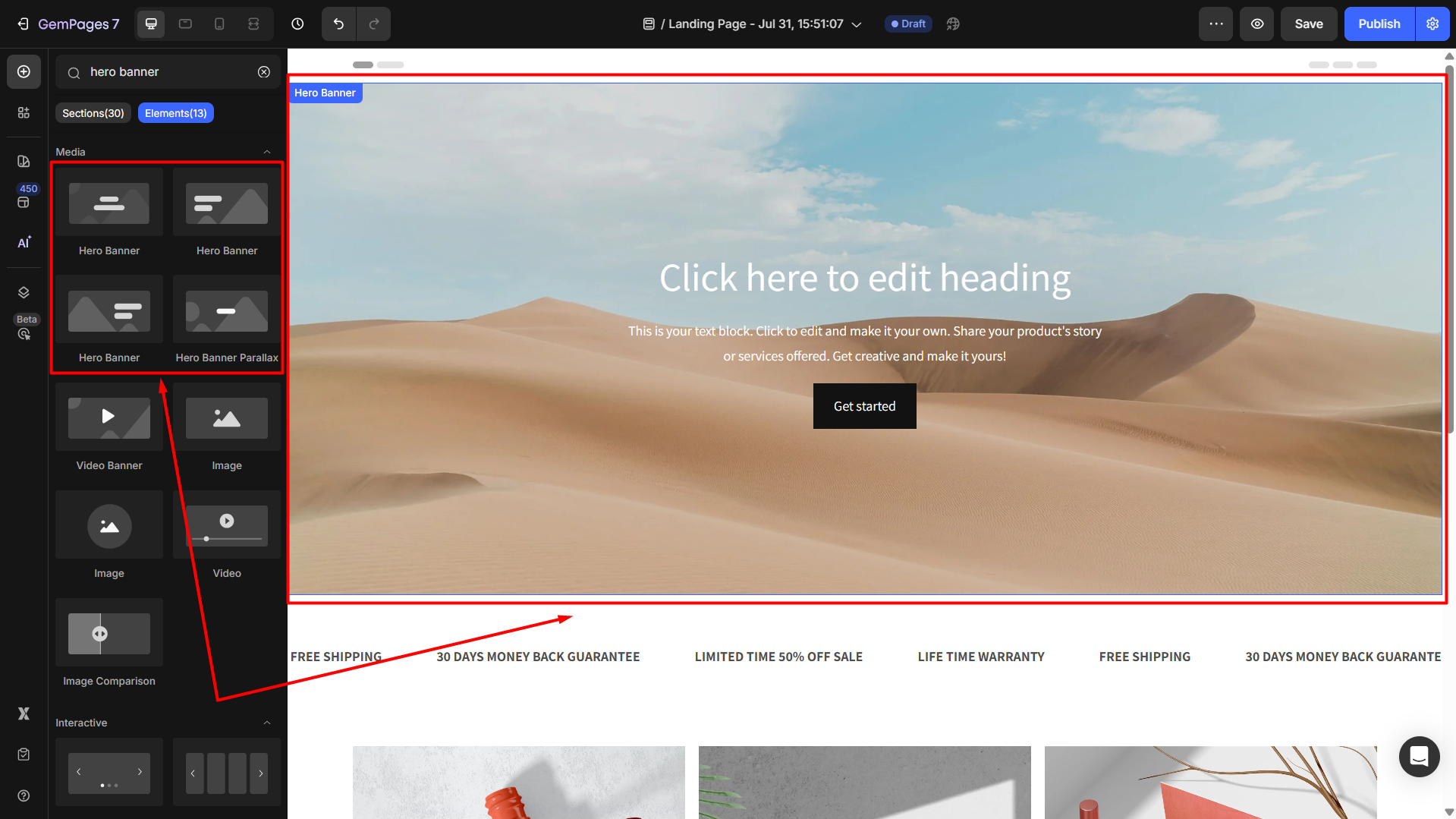 - From the left sidebar, enter Hero Banner in the search bar. Then, drag and drop a Hero Banner element to your preferred position.