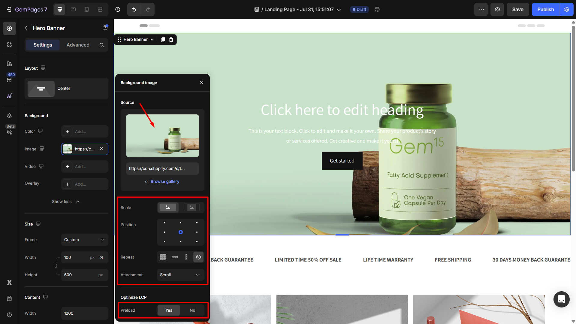 - Adjust the scale, position, repeat, and attachment for the image. Also, you can set the Preload to Yes to optimize LCP.