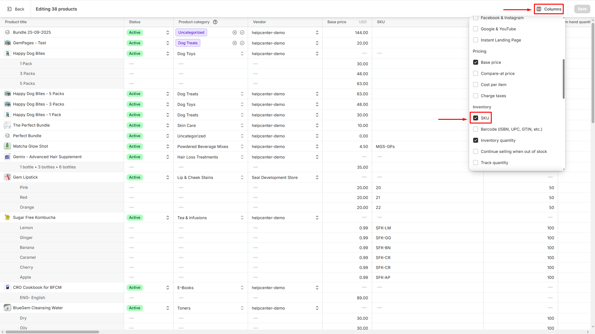 Step 2: Click the Columns button, scroll down to the Inventory section, and select the SKU to add the SKU column to the table.