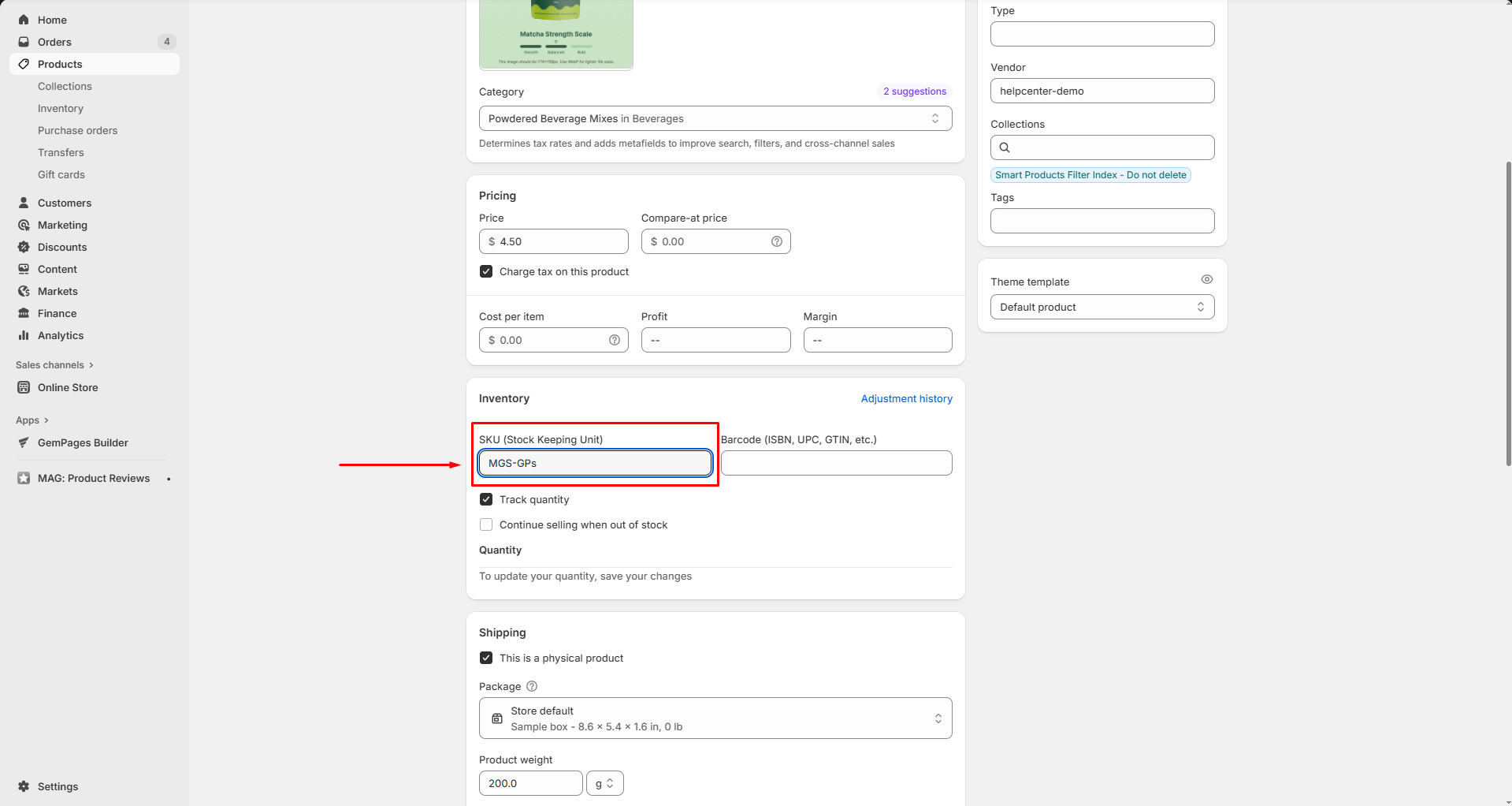 - For single-variant products: Scroll to Inventory, then enter your SKU in the SKU field.