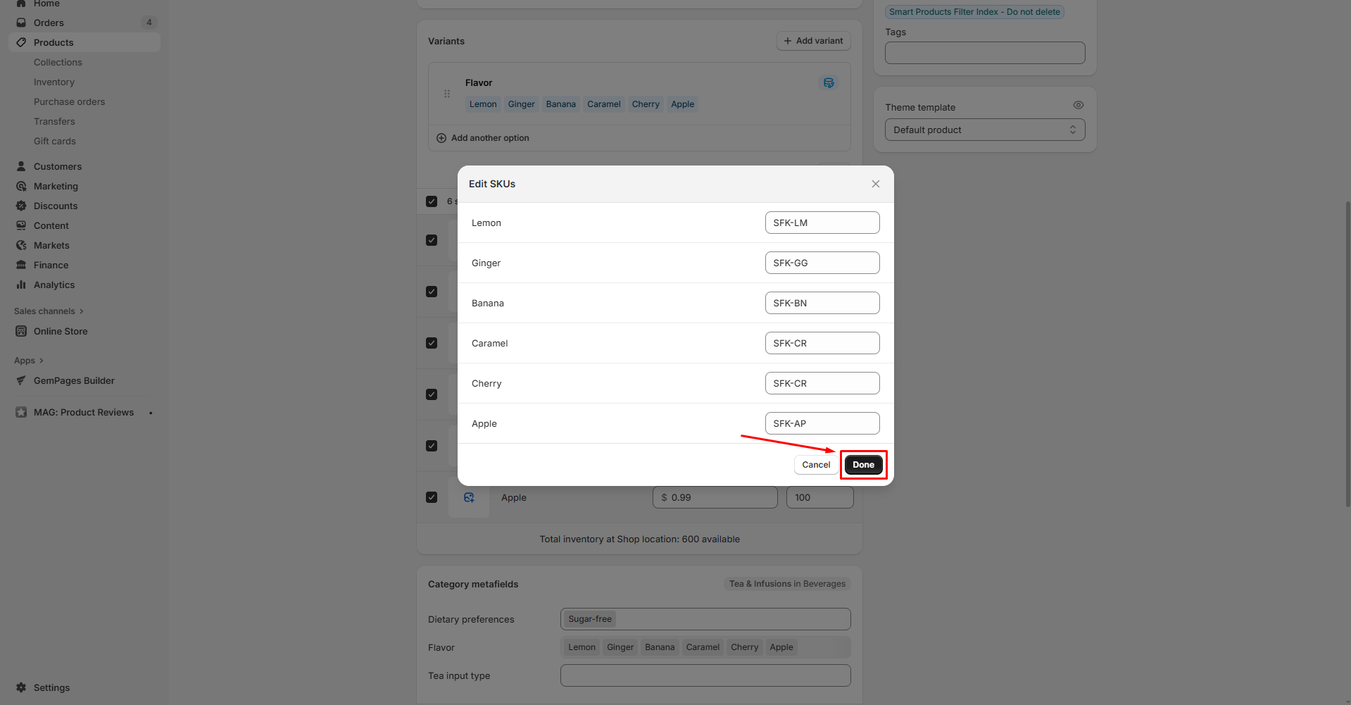 Then, fill SKU for each variant, and click Done to save your updates.