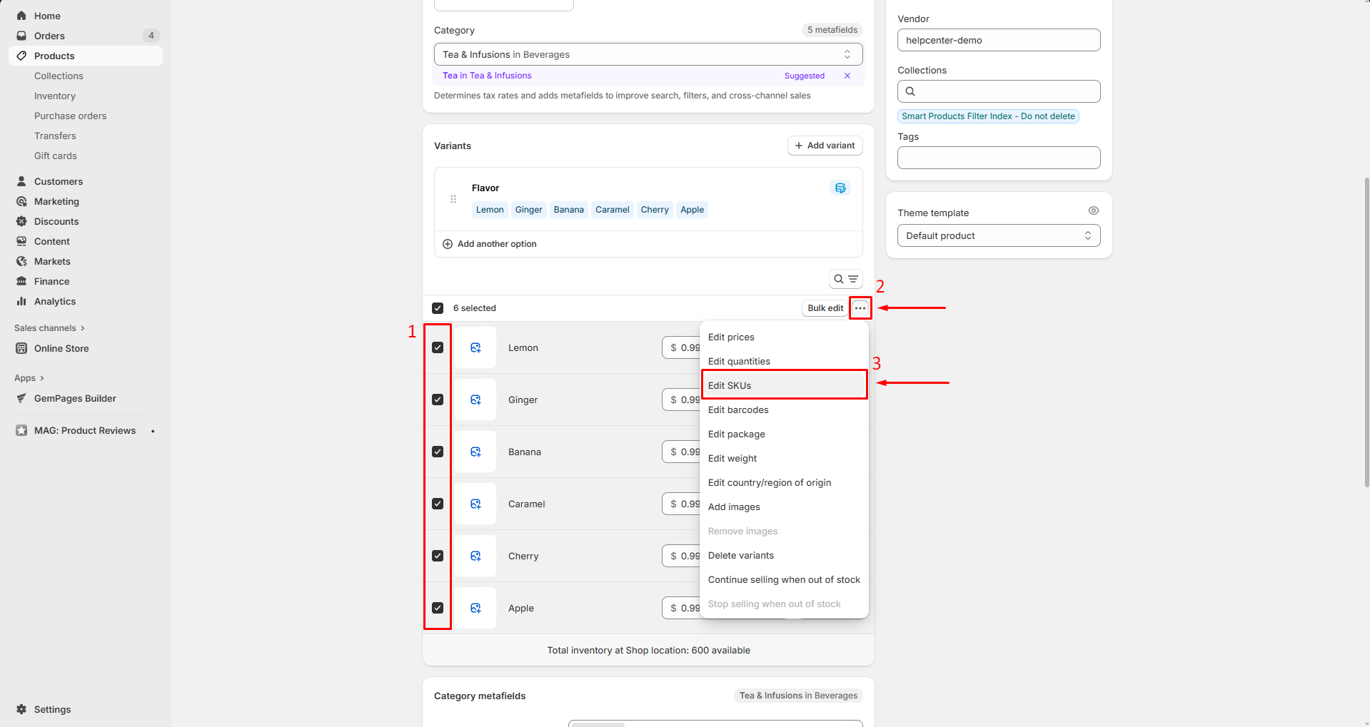 Locate the Variants section, select all variants, and click the three-dot button > Edit SKUs.