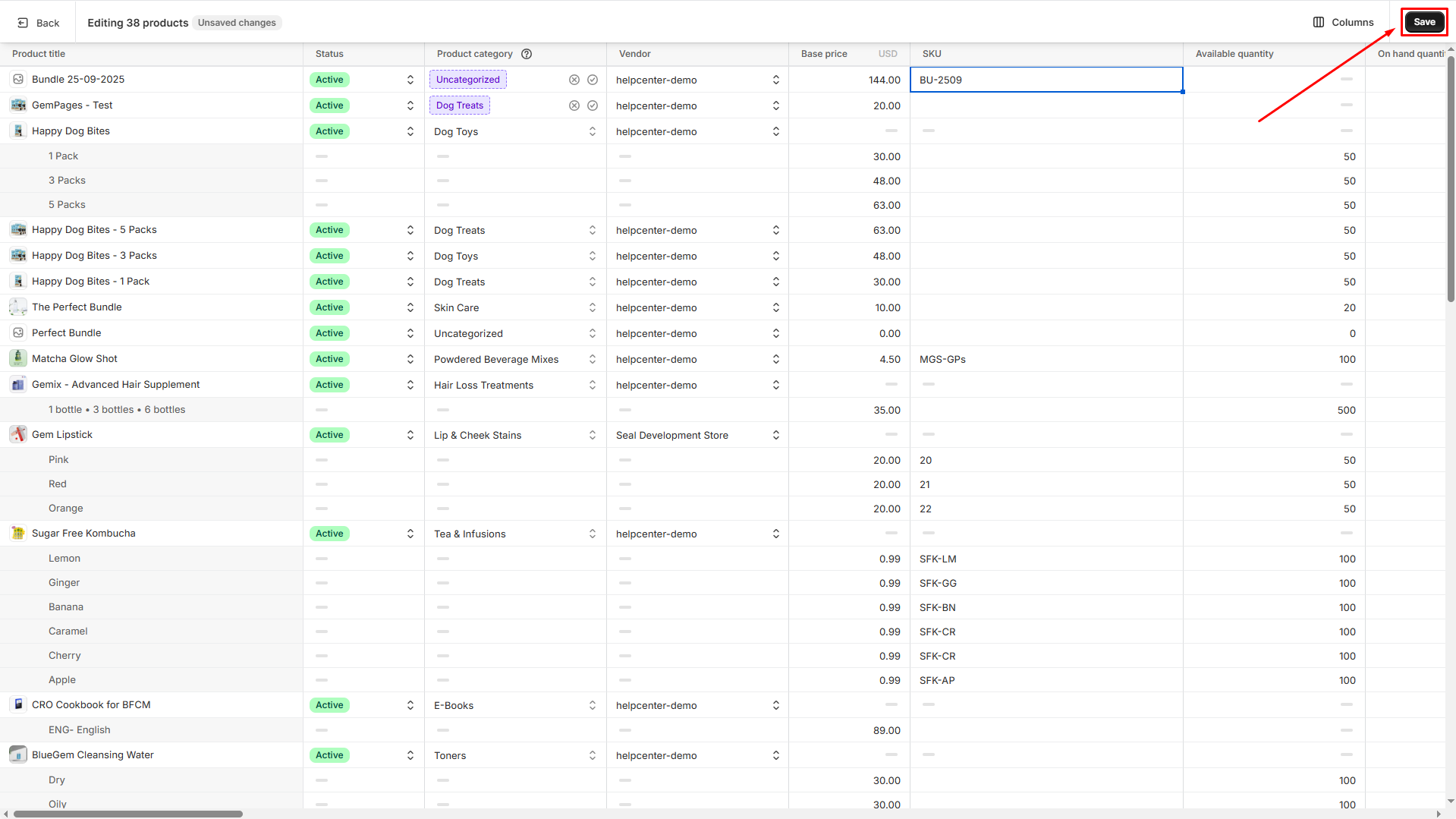 Step 3: Enter the SKU for each product and variant. Once done, click the Save button.