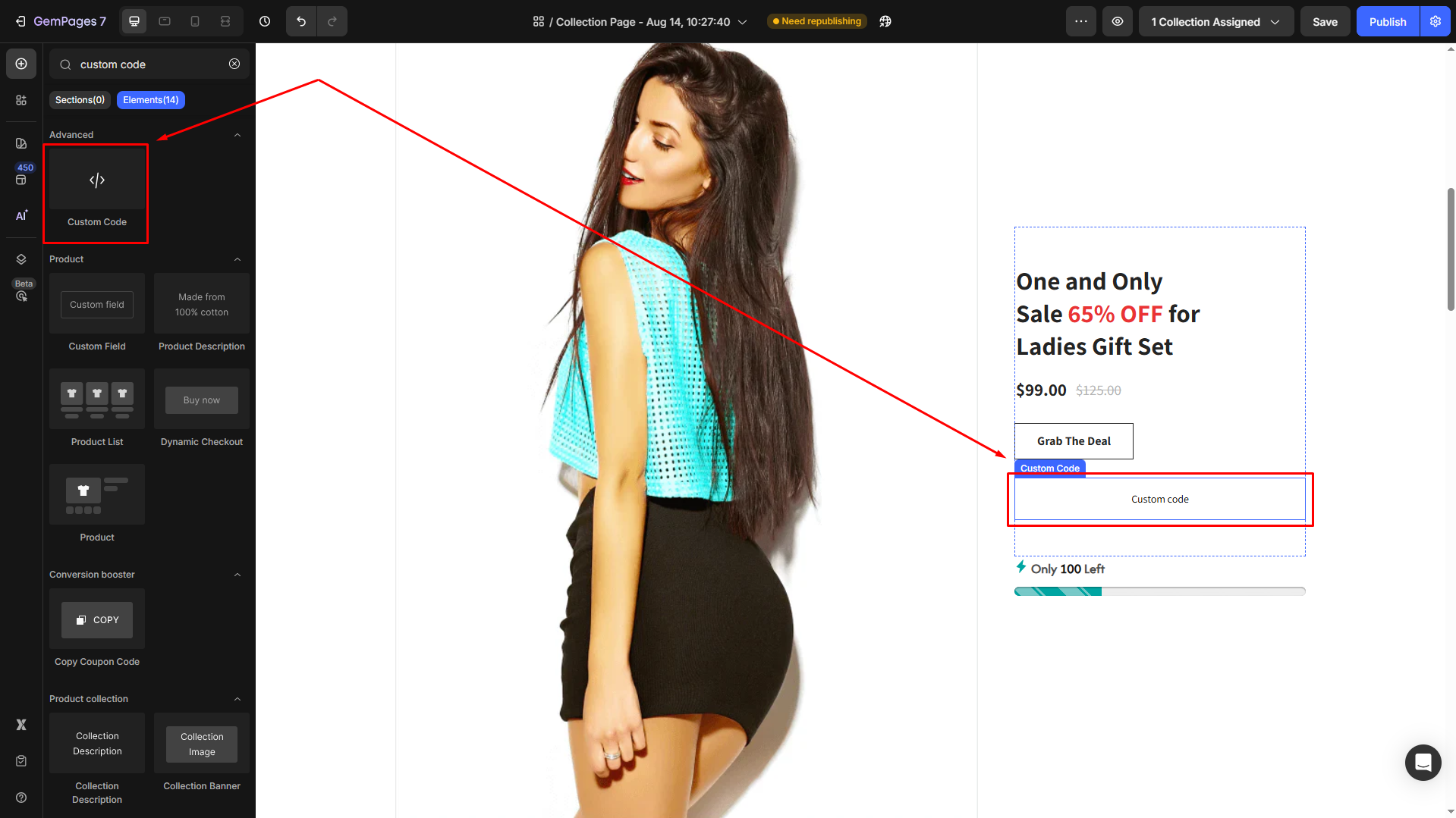 Step 4: In the GemPages editor, drag the Custom Code element from the sidebar and place it where you want the size chart to appear.
