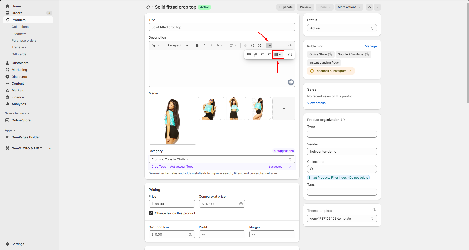 Step 2: Under the Description section, create a size chart using the Table function. When done, click Save.