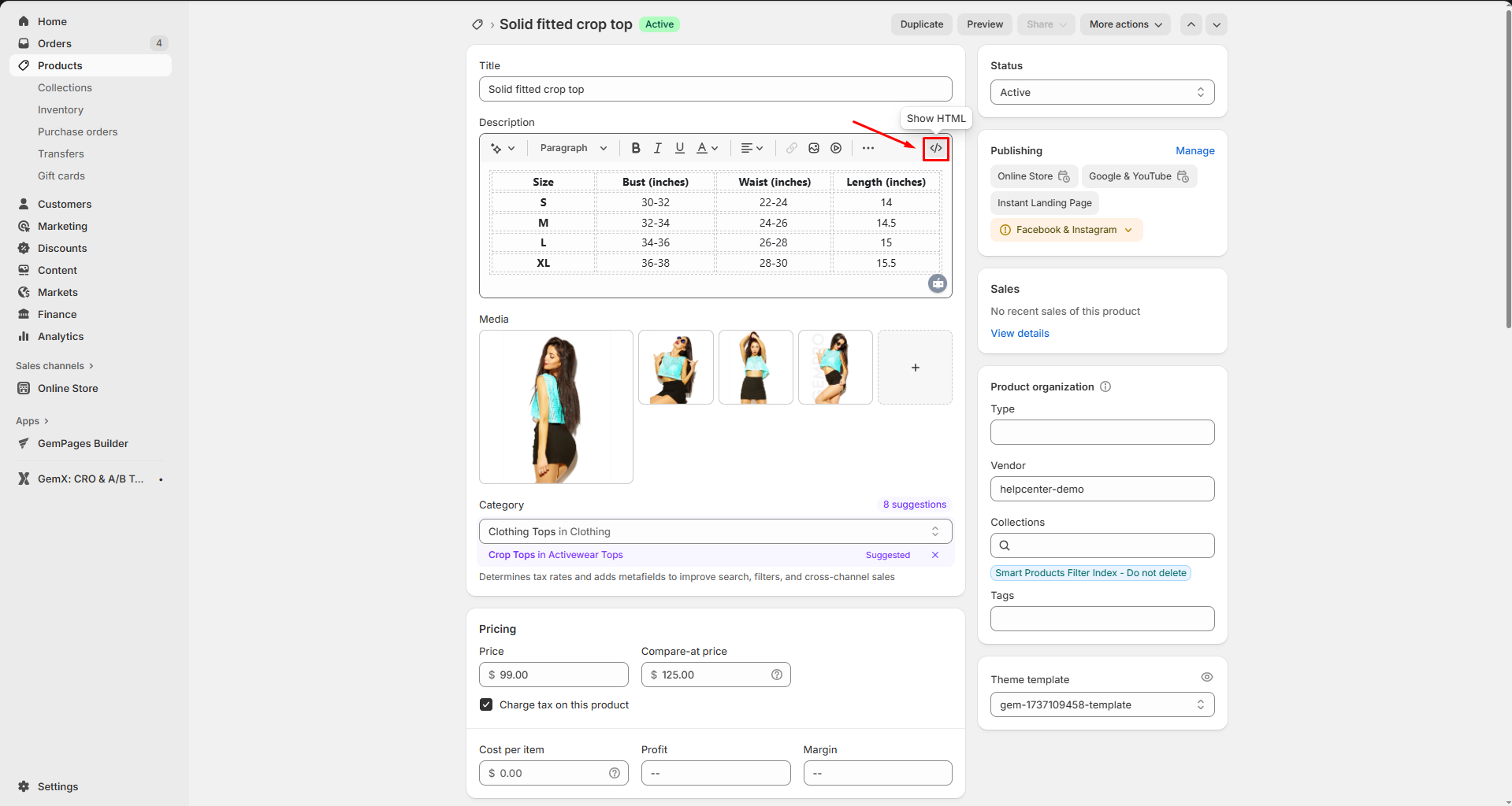 Step 3: In the Description editor, switch to HTML mode by clicking the Show HTML button.