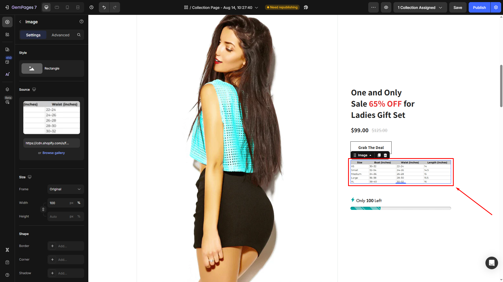 Step 4: Once the size chart image is uploaded, you can modify its settings your way.