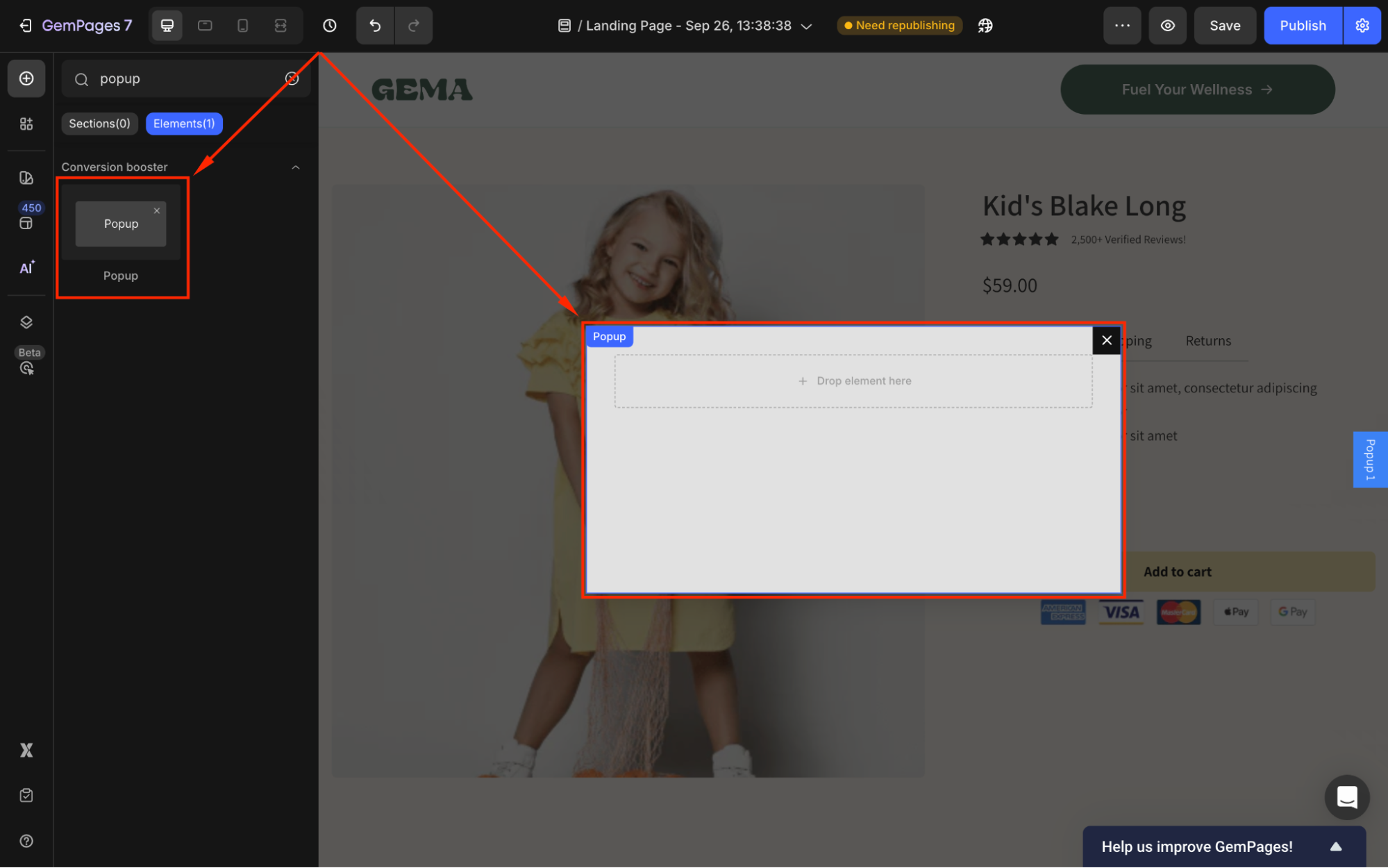 Step 1: Once located in the GemPages Editor, you can use the search bar to find the Popup Element. Then, drag and drop the element into the design area.