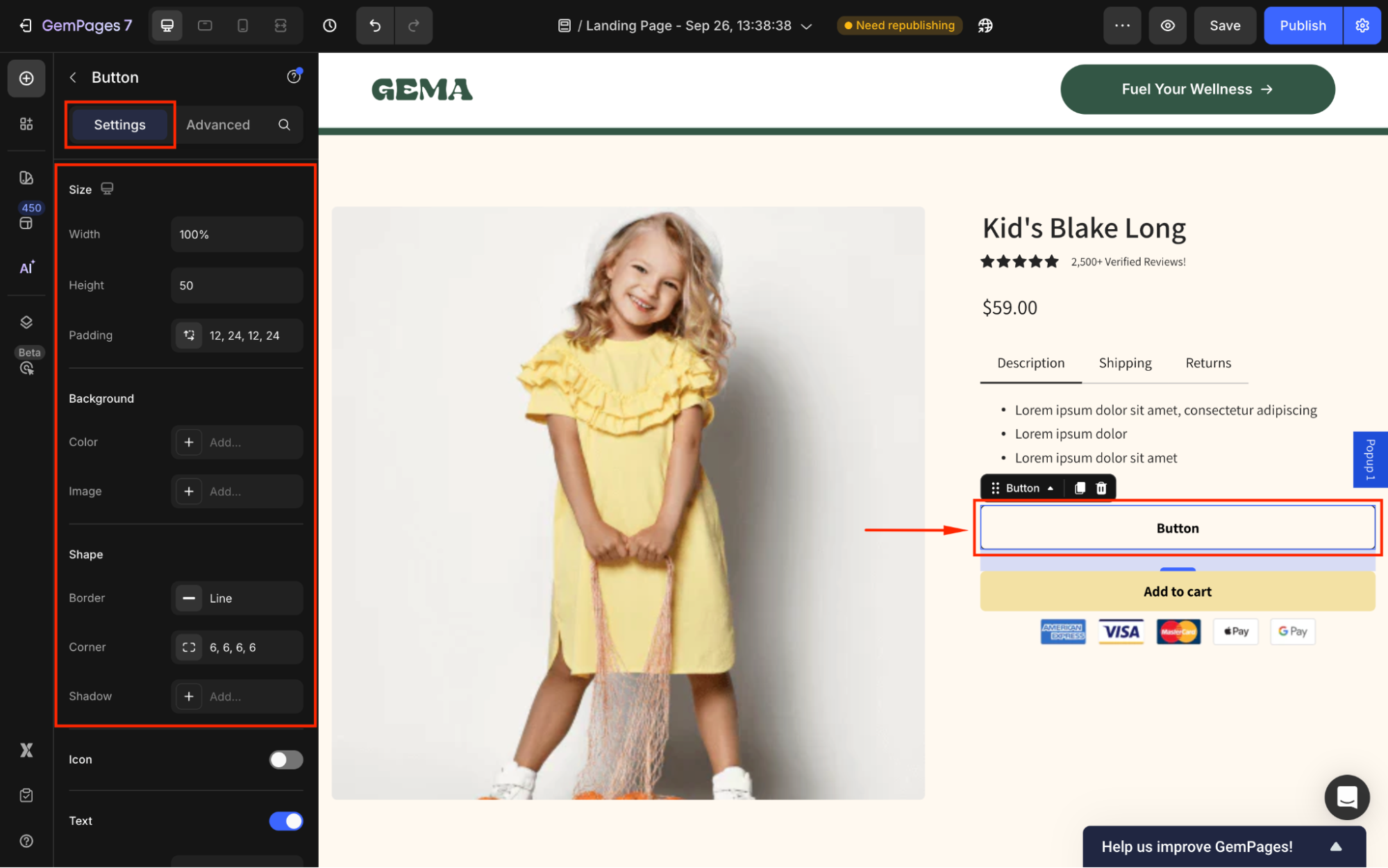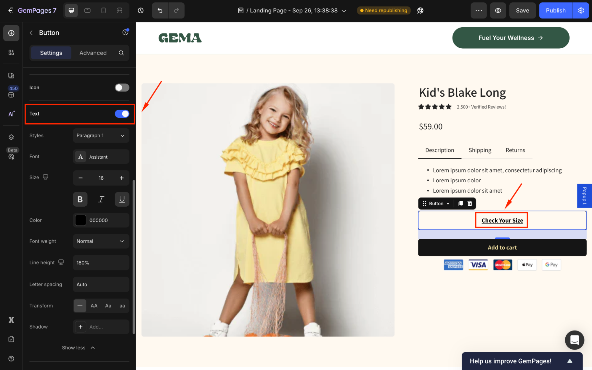 Then, edit the button text and configure the text style. You can try “Check your size” or “Size Guide” to trigger your visitors to click it.