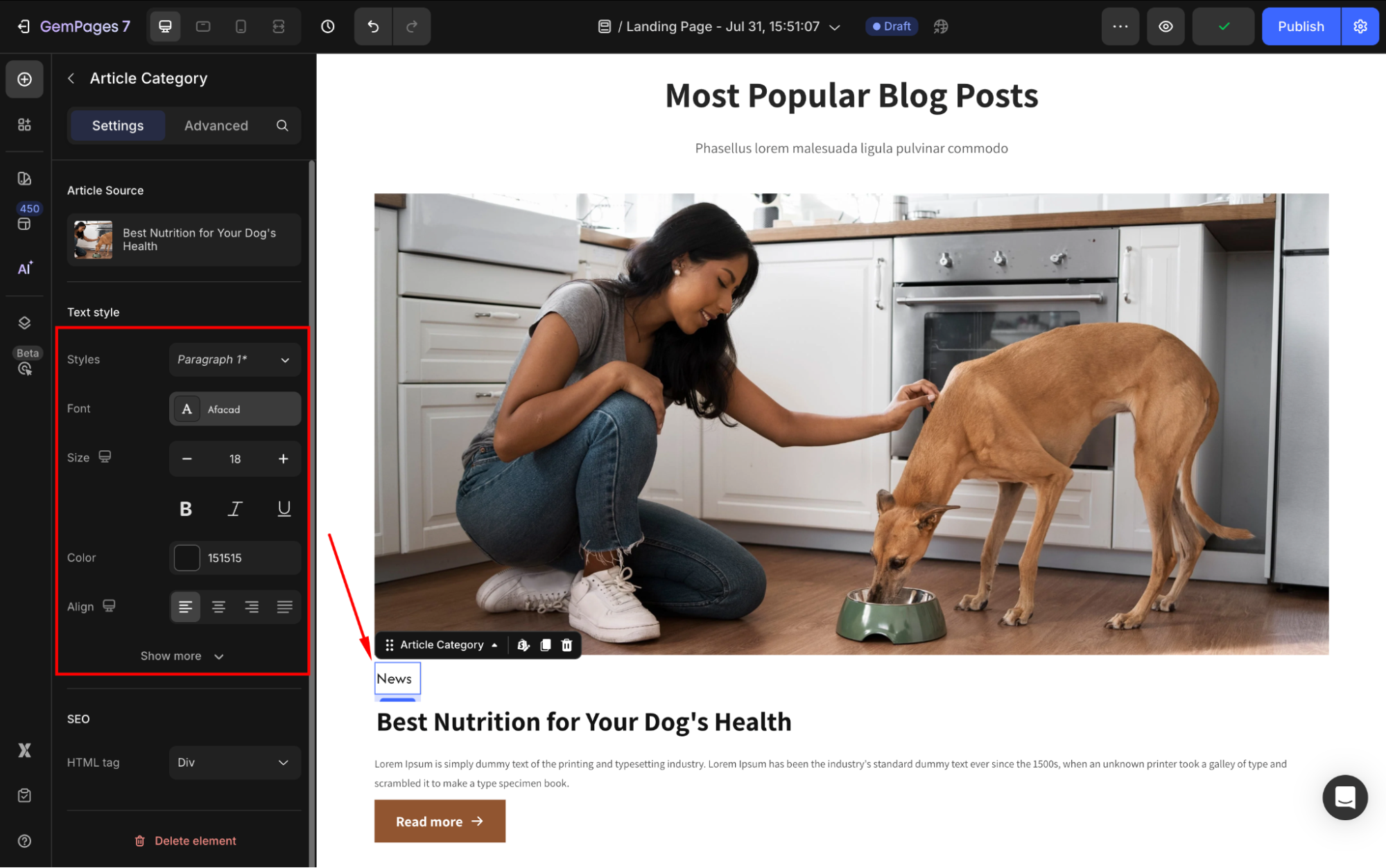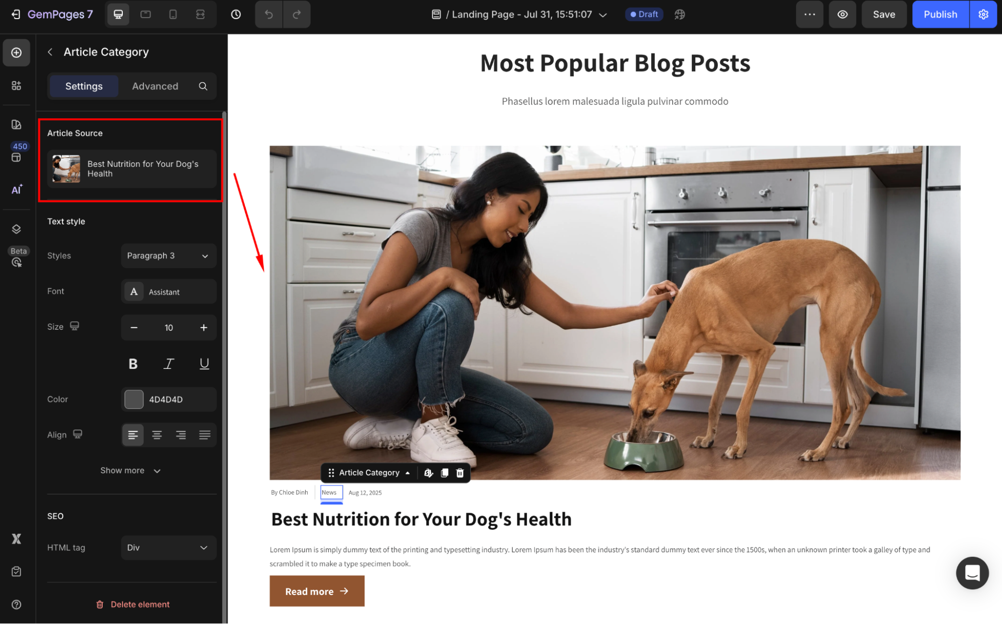 Step 2: From the left sidebar, search for the Article Category Element and drag & drop it to the preferred position on your page.