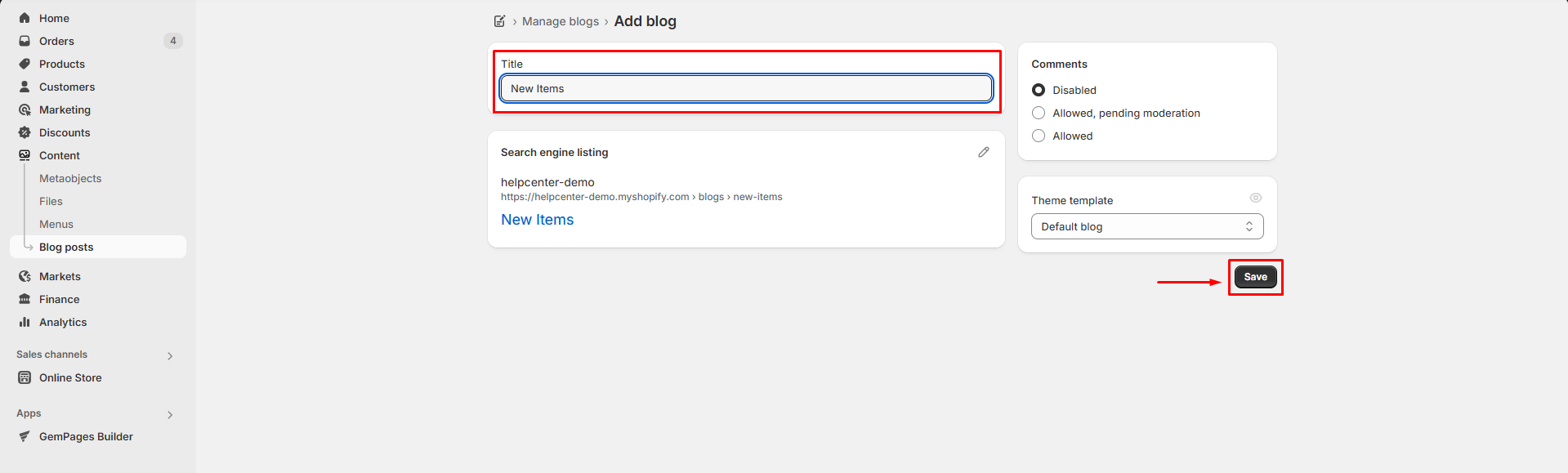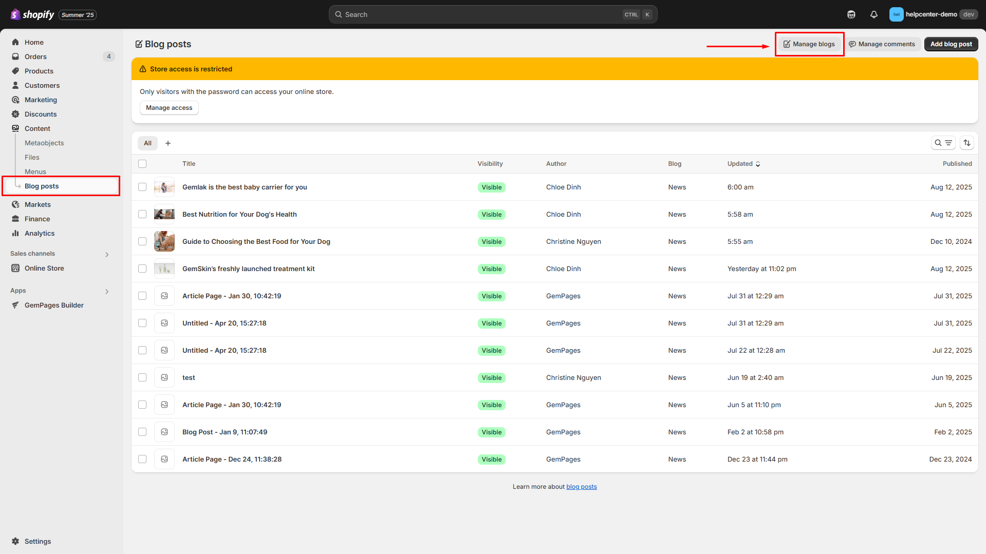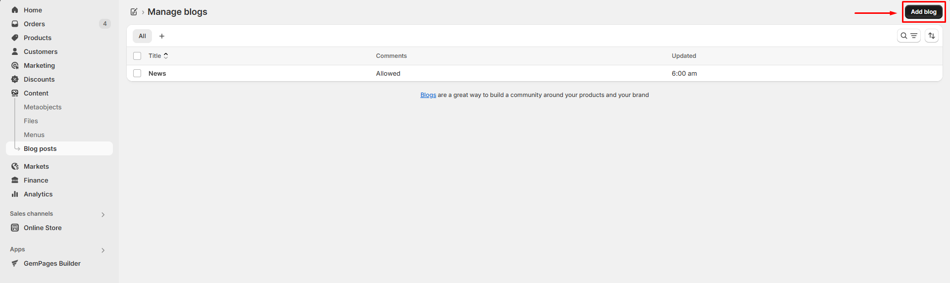 - Navigate to Online Store > Blog Posts > Manage Blogs.