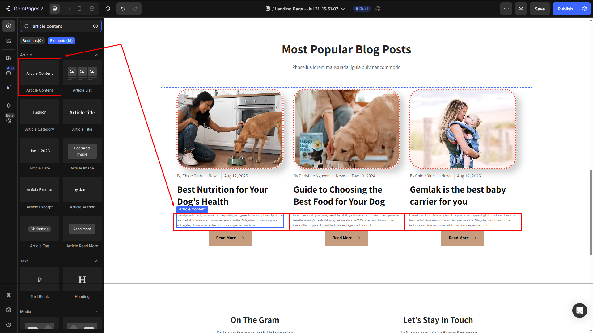Step 2: From the left sidebar, search for the Article Content Element and drag & drop it to the preferred position on your page