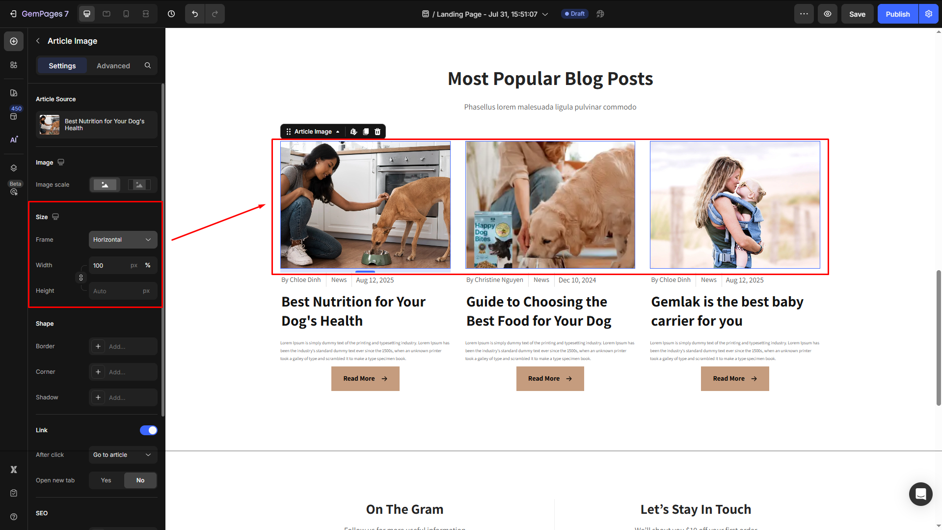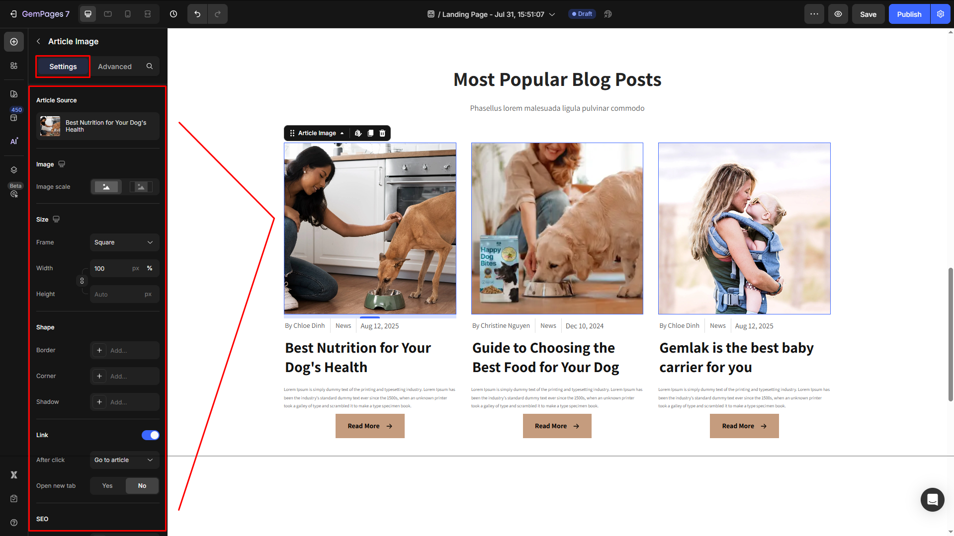 - Shadow: You may add a shadow of the Article List section and adjust the shadow display (size, color, blur, and distance)