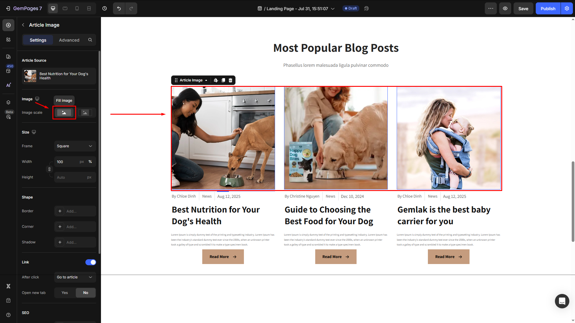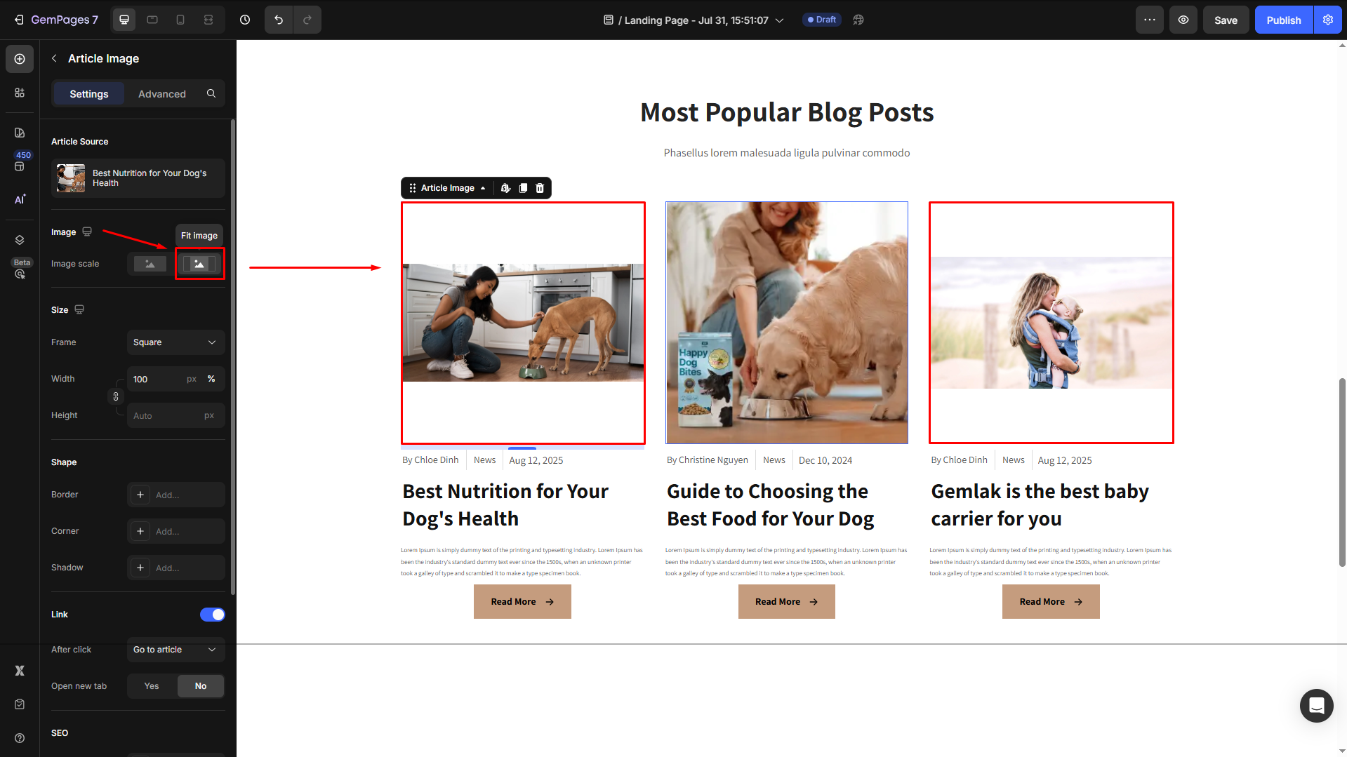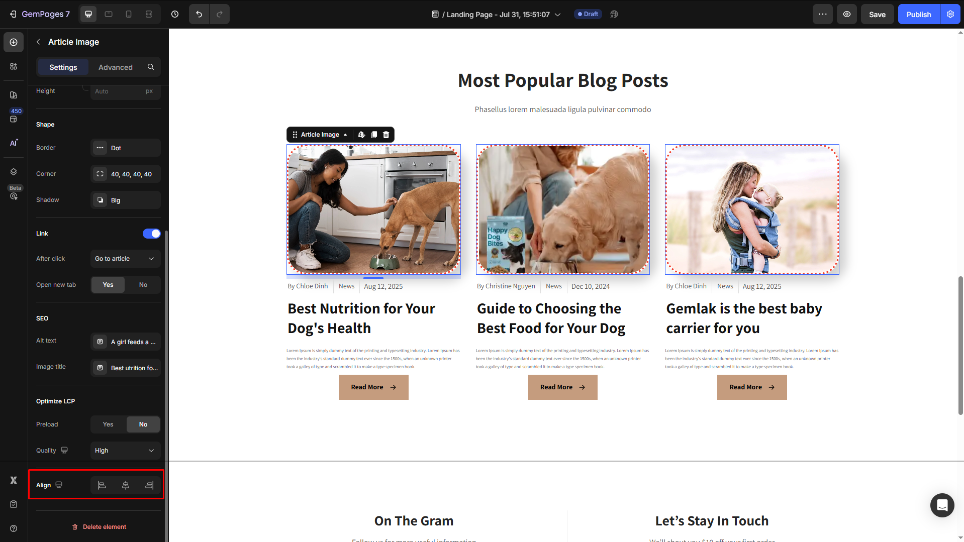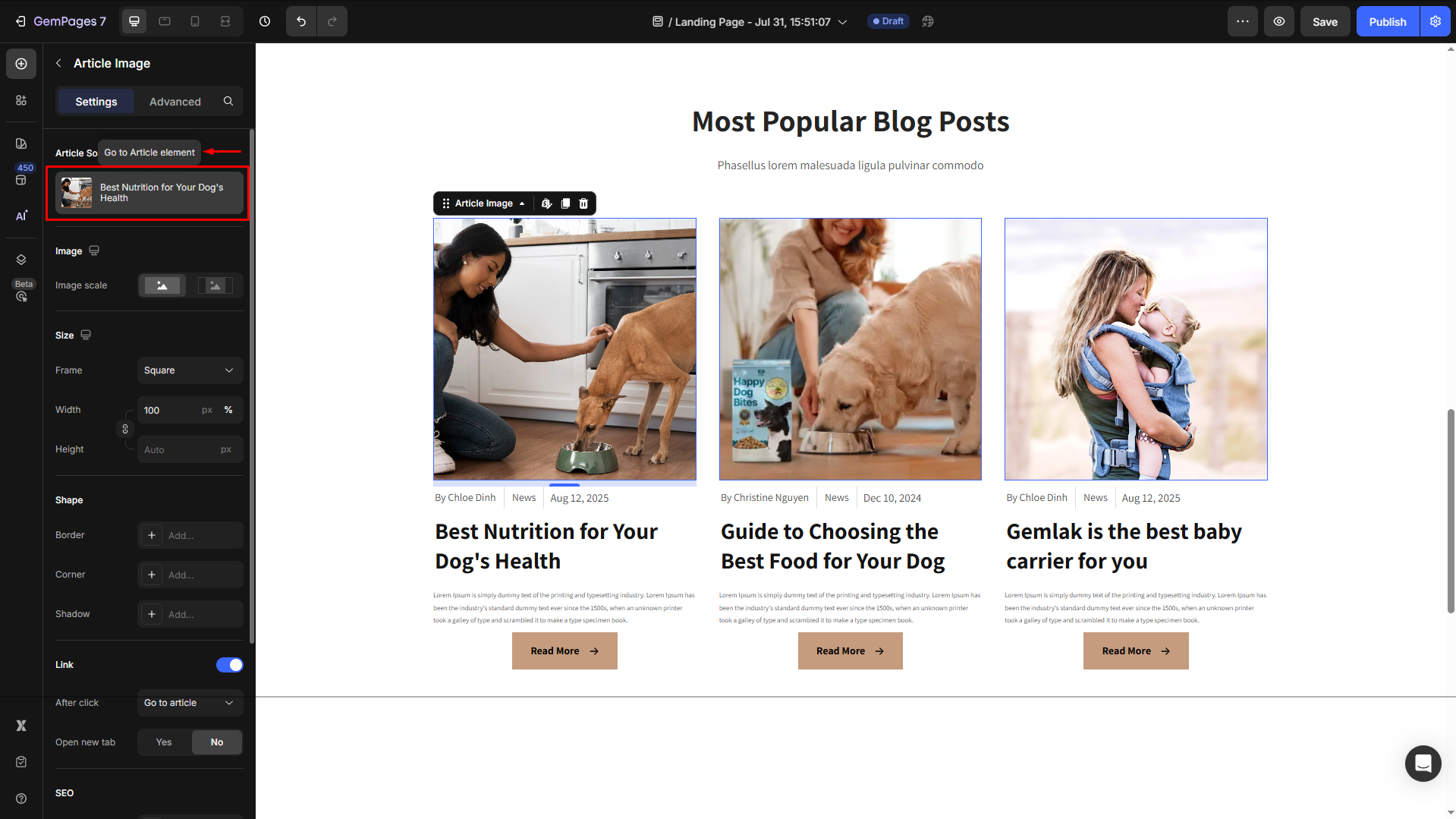 The Article Image Element includes several customization options to suit your design and functionality needs: