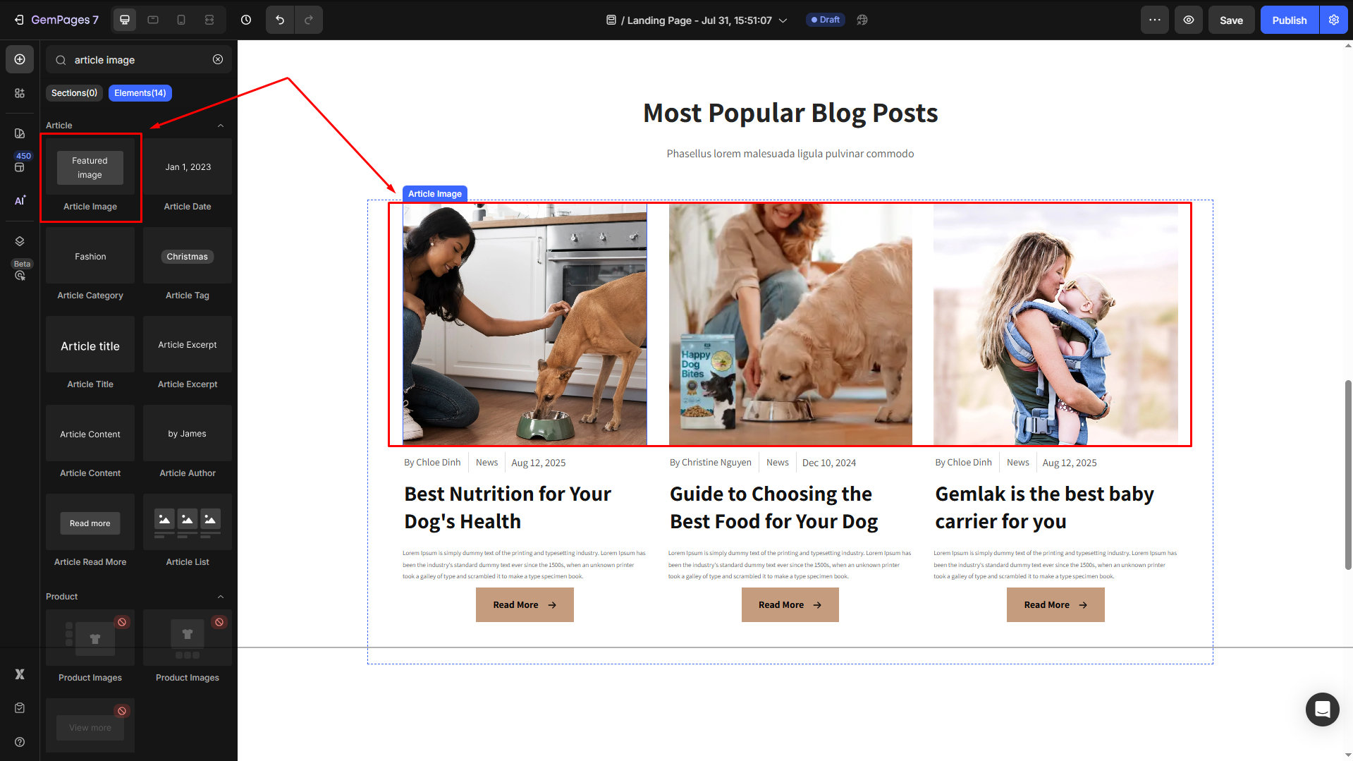 Step 2: From the left sidebar, search for the Article Date Element and drag & drop it to the preferred position on your page.