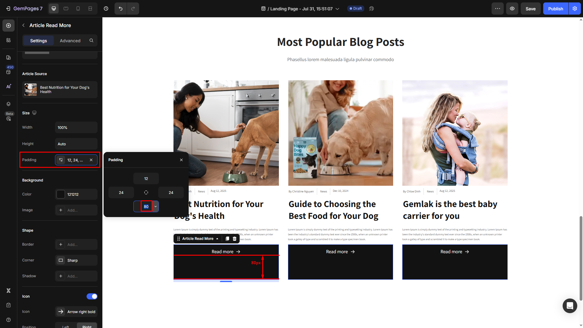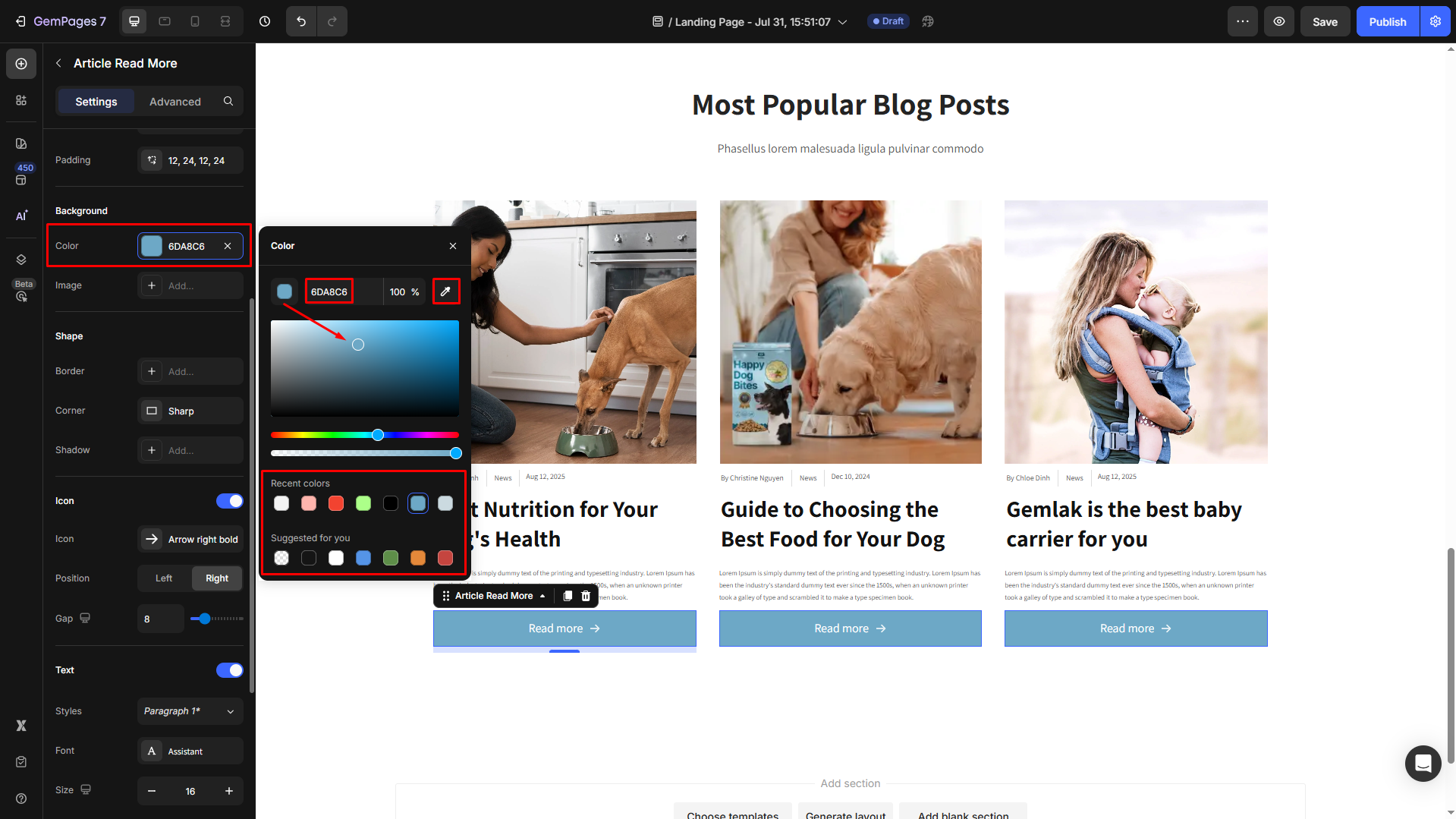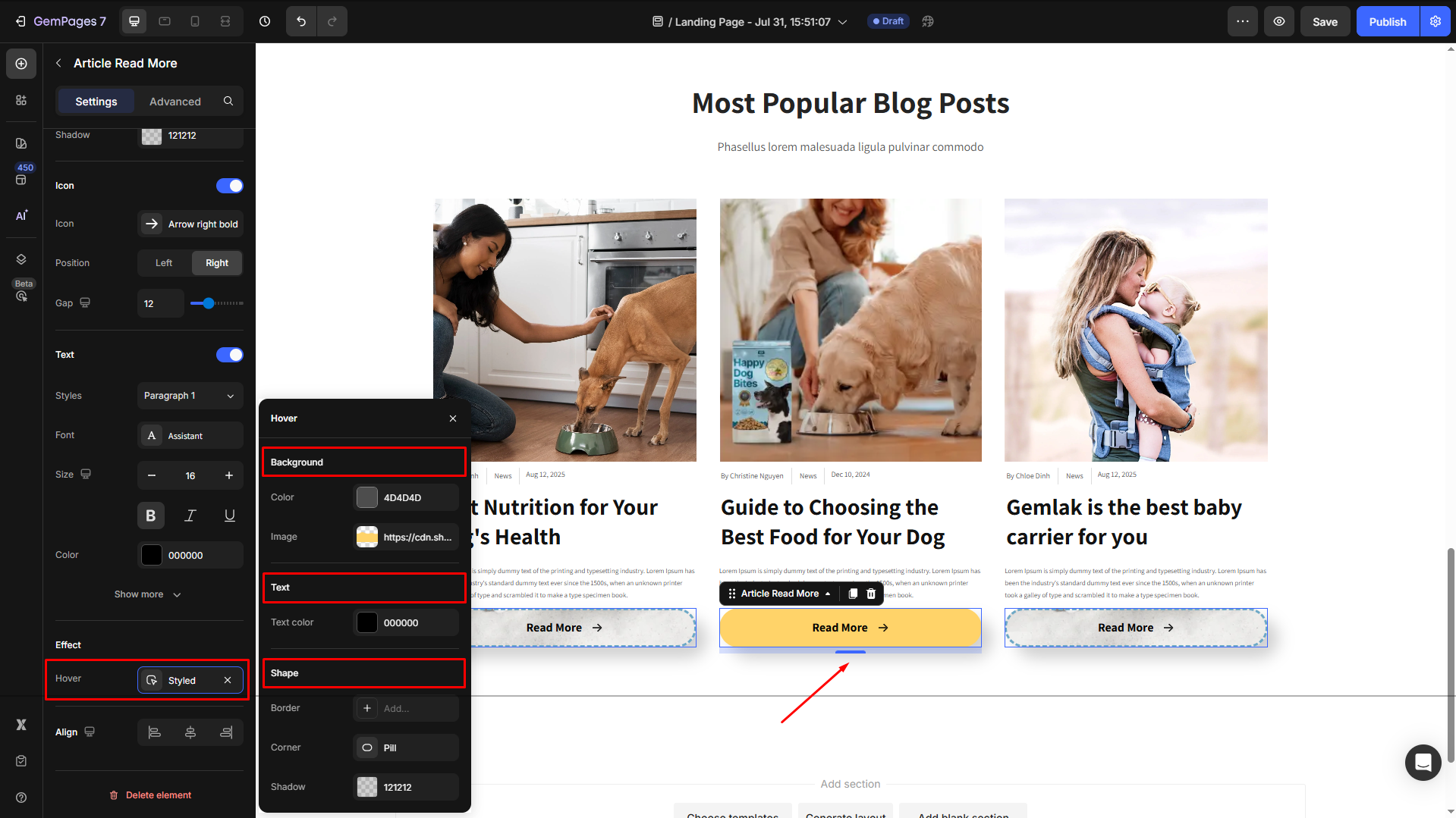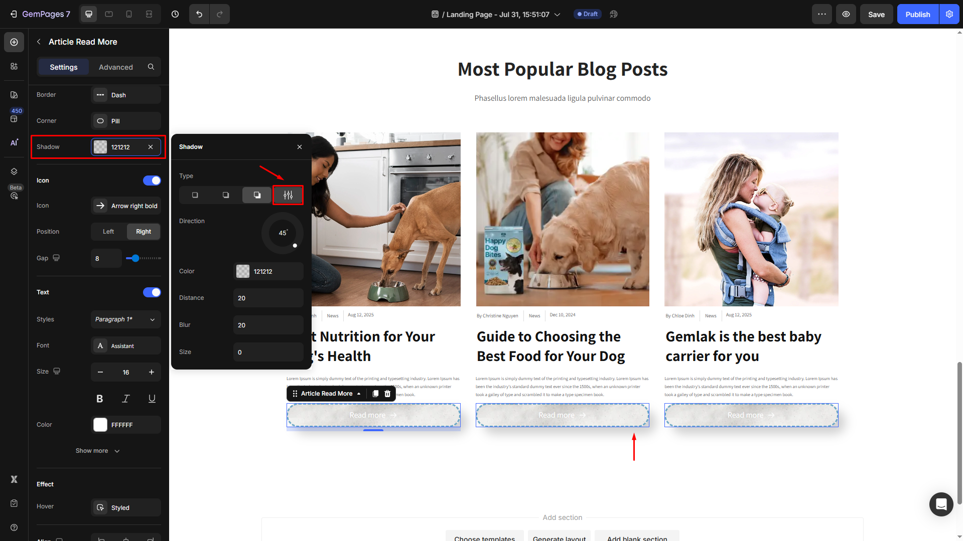 - Shadow: You may add a shadow of the Article List section and adjust the shadow display (size, color, blur, and distance).