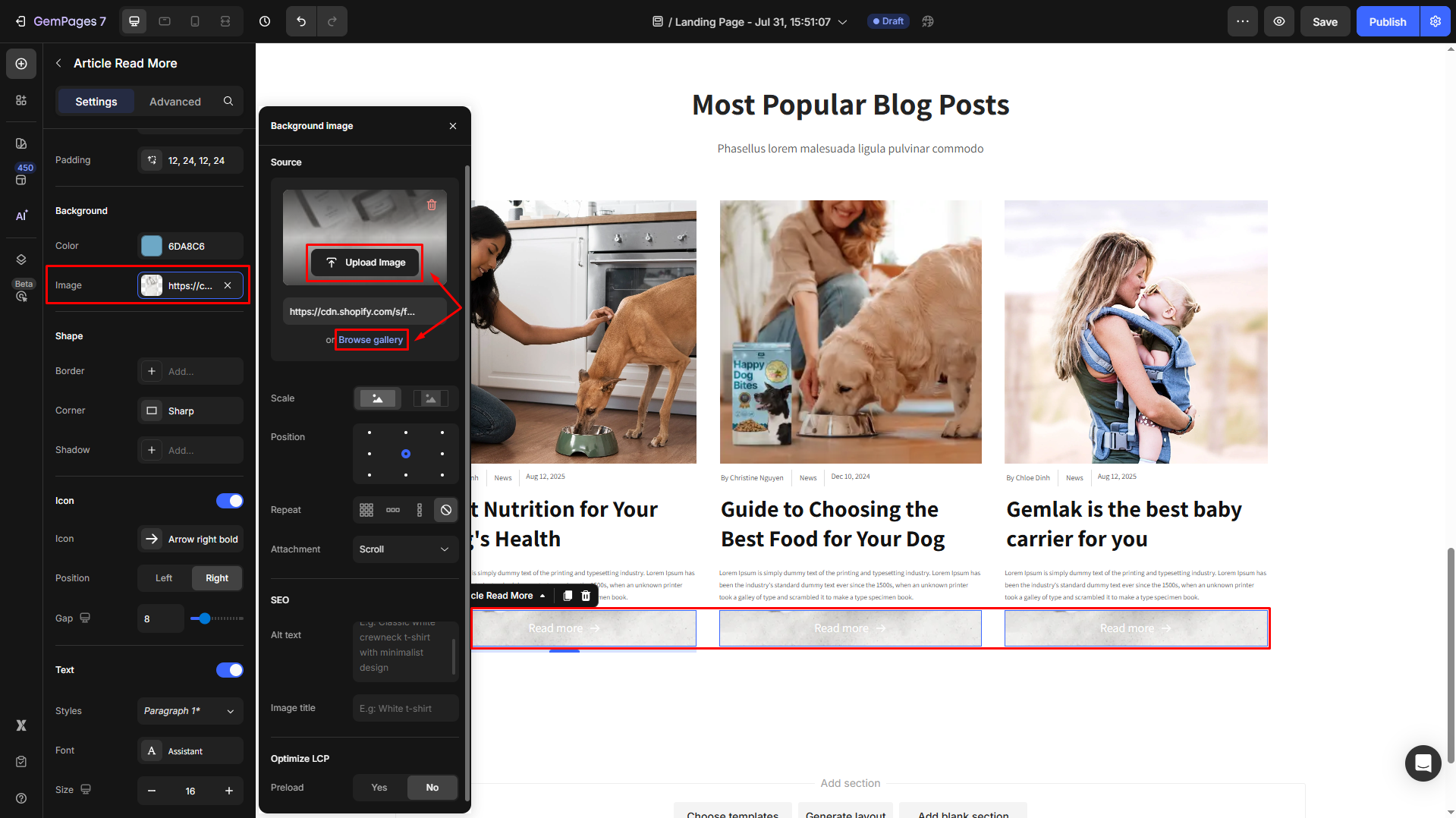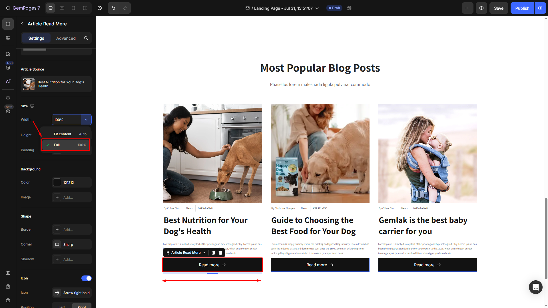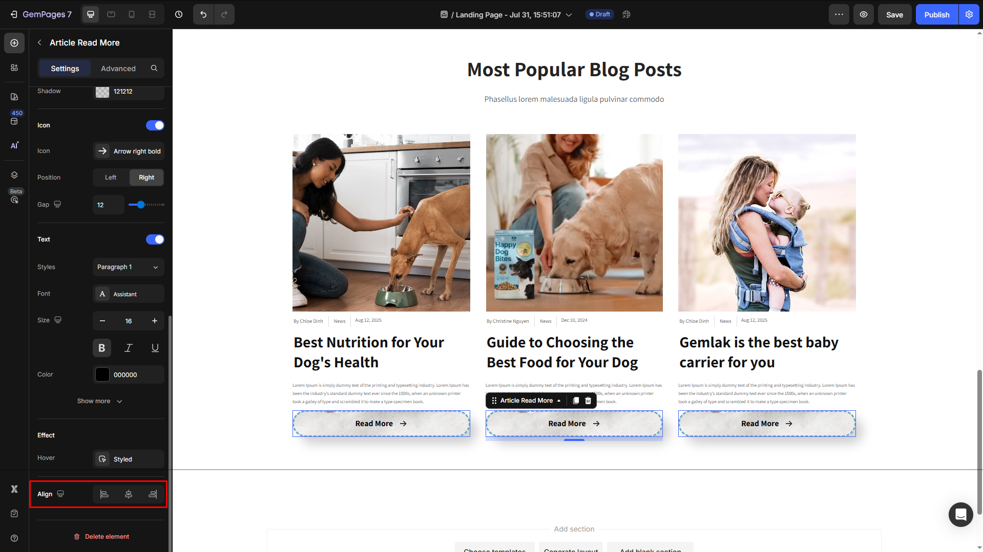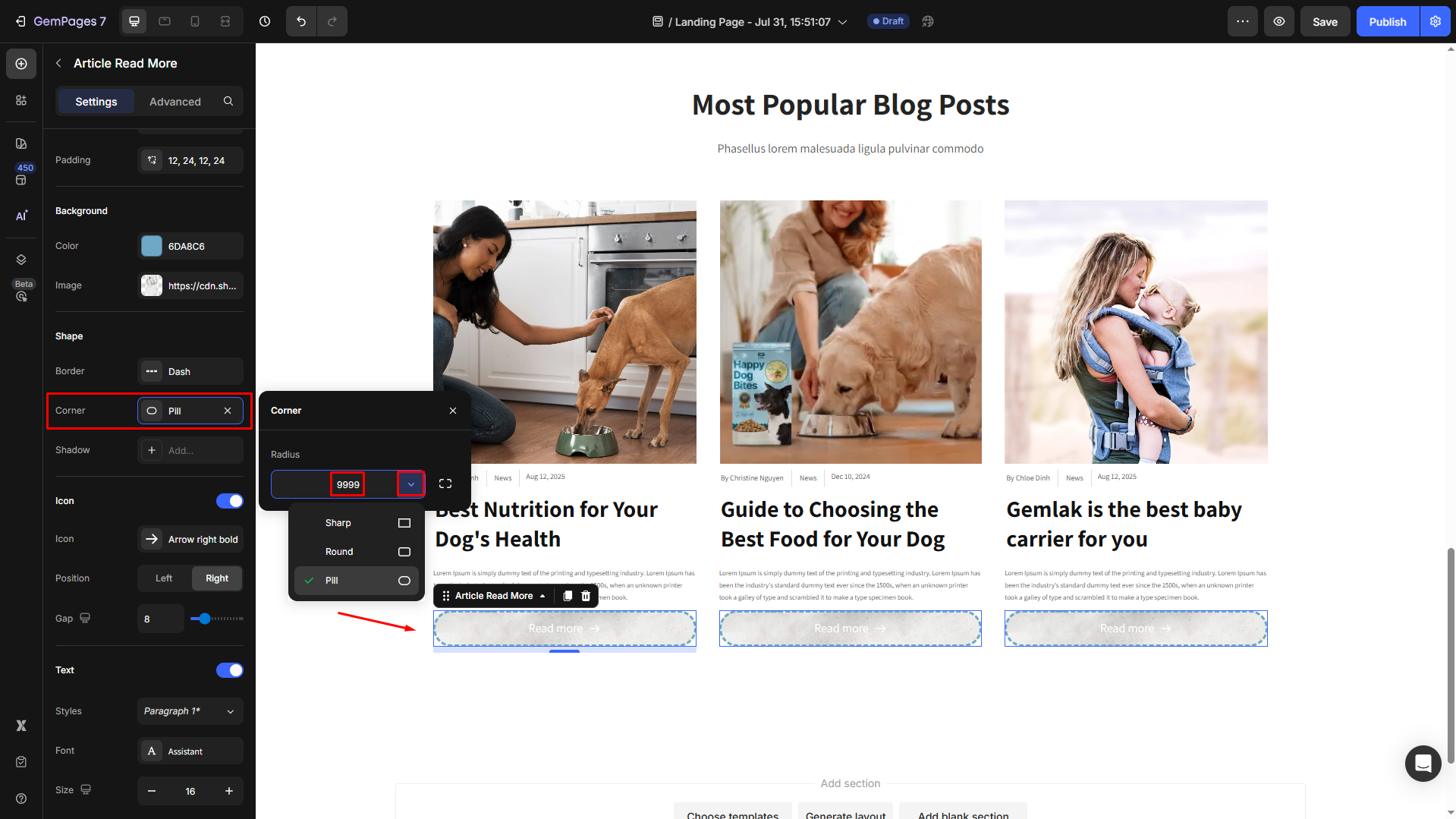 - Shadow: You may add a shadow of the Article List section and adjust the shadow display (size, color, blur, and distance).