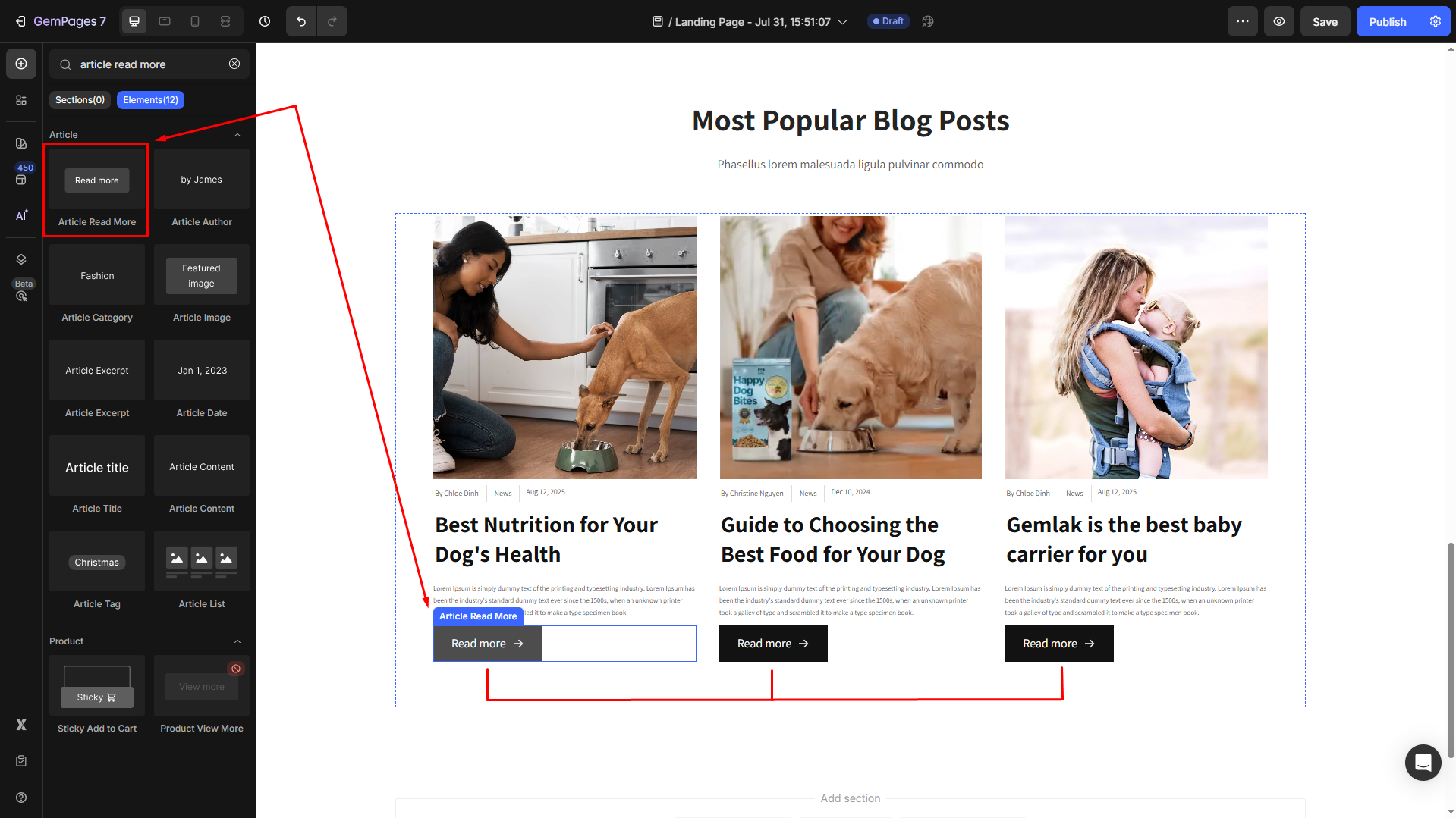 Step 2: From the left sidebar, search for the Article Read More Element and drag & drop it to the preferred position on your page.