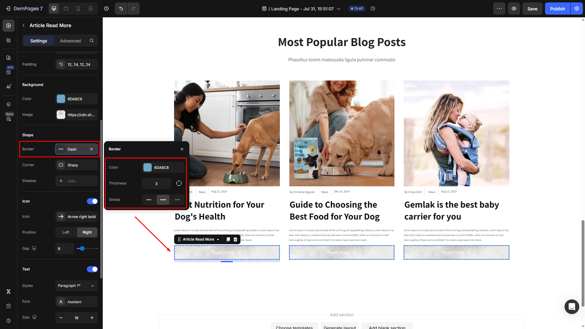 - Border: You can change the border color, thickness, and stroke for your Article List section.