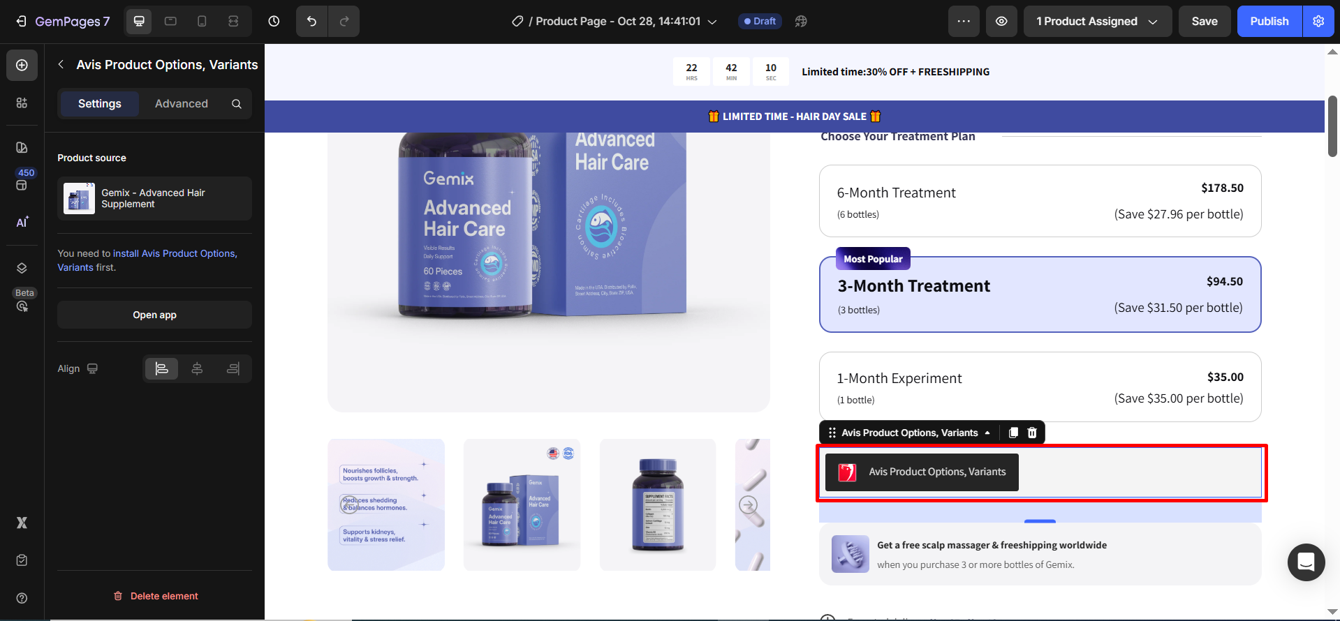 How to Add the Avis Product Options, Variants App Element to GemPages v7?