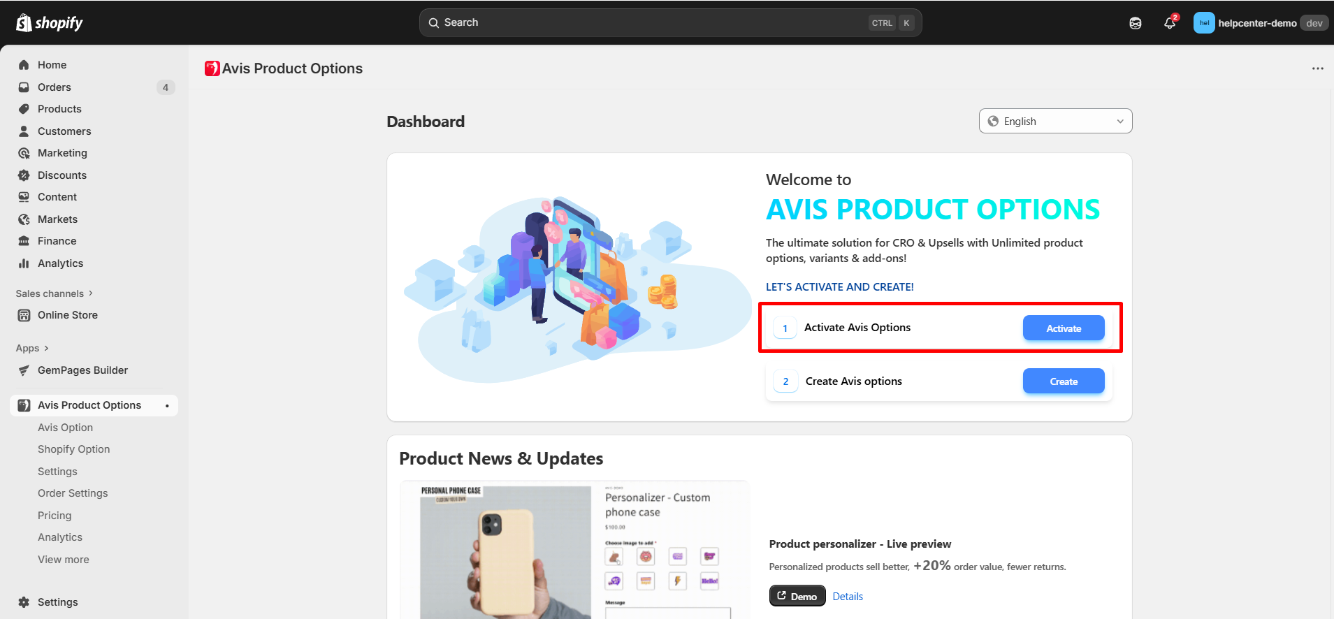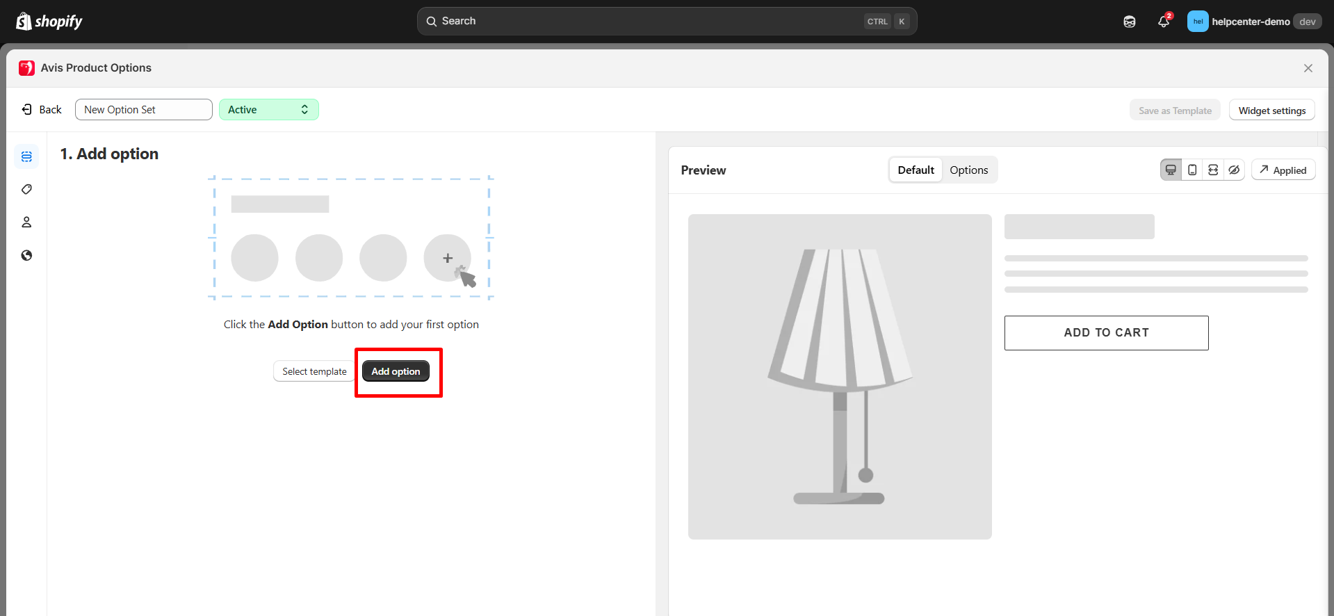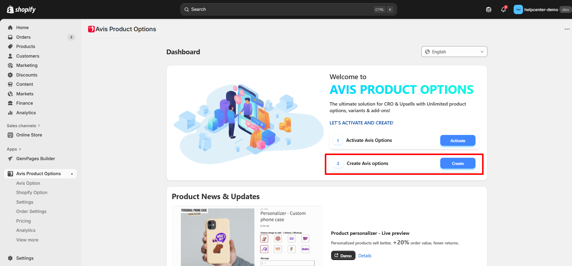Step 4: Open the Avis Product Options app. Get started by clicking on the “Create” button.