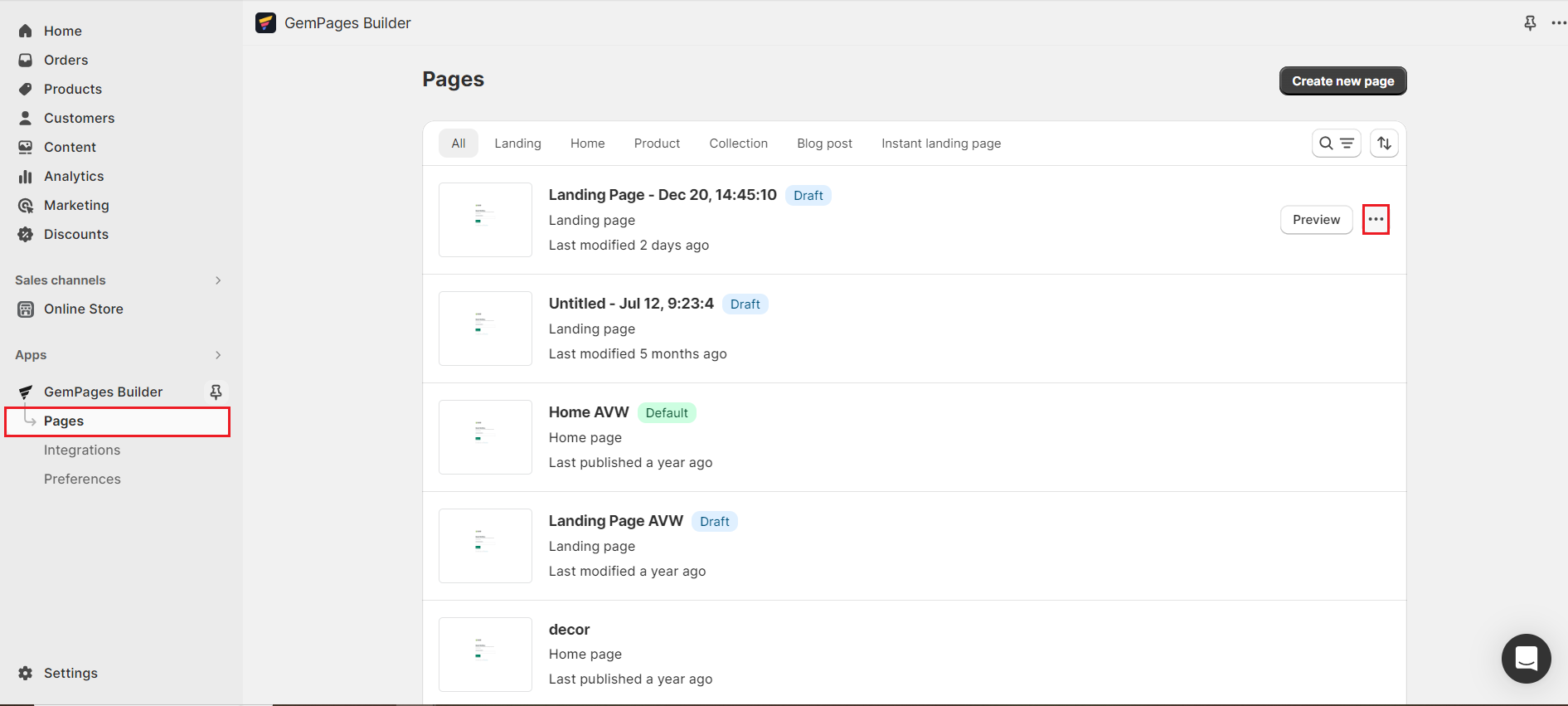 Step 2: Click on the dropdown menu to access a list of your installed apps, and then choose GemPages Builder. Click on “Pages” to access the full page list of your account.