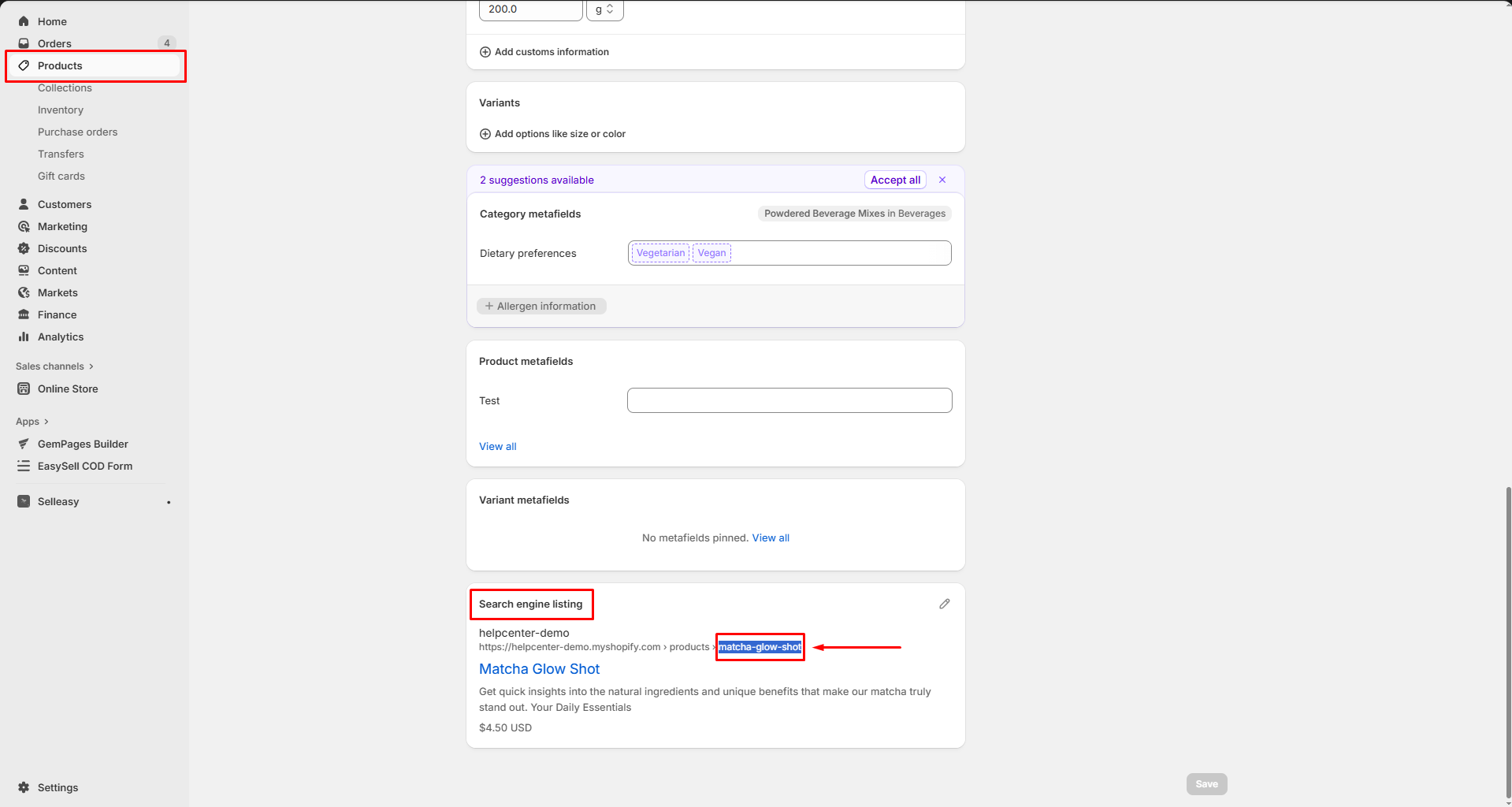 - Scroll down to the Search engine listing and copy the product handle listed after “/products/”.