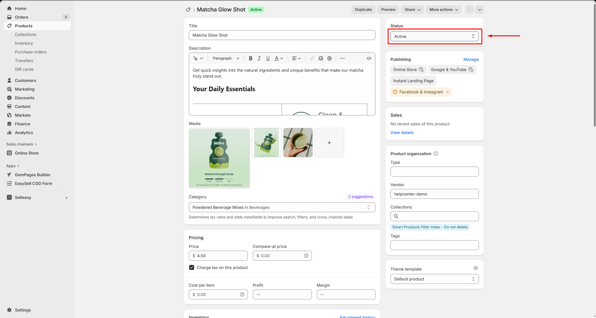 - Ensure the Product Status is set to “Active“.