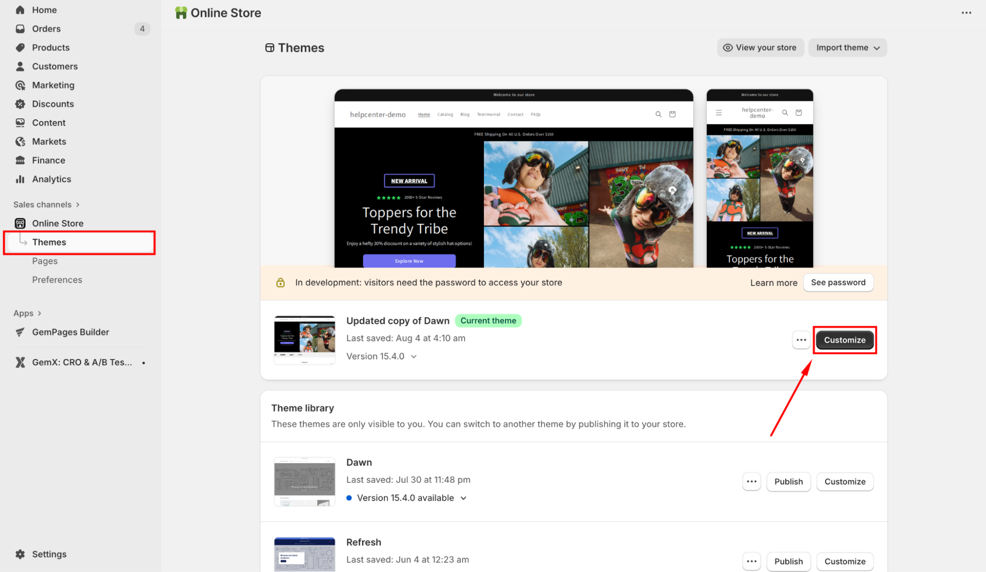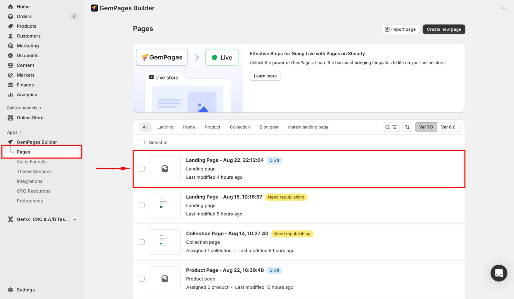 Step 1: From your Shopify Admin, navigate to the GemPages Builder app > Pages. Click on your page on which you want to change the text size to open the GemPages Editor.