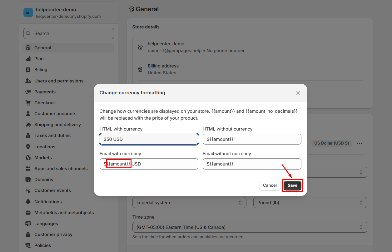 Step 3: In each field, replace {{amount}} with the currency format that you prefer to use and hit Save.