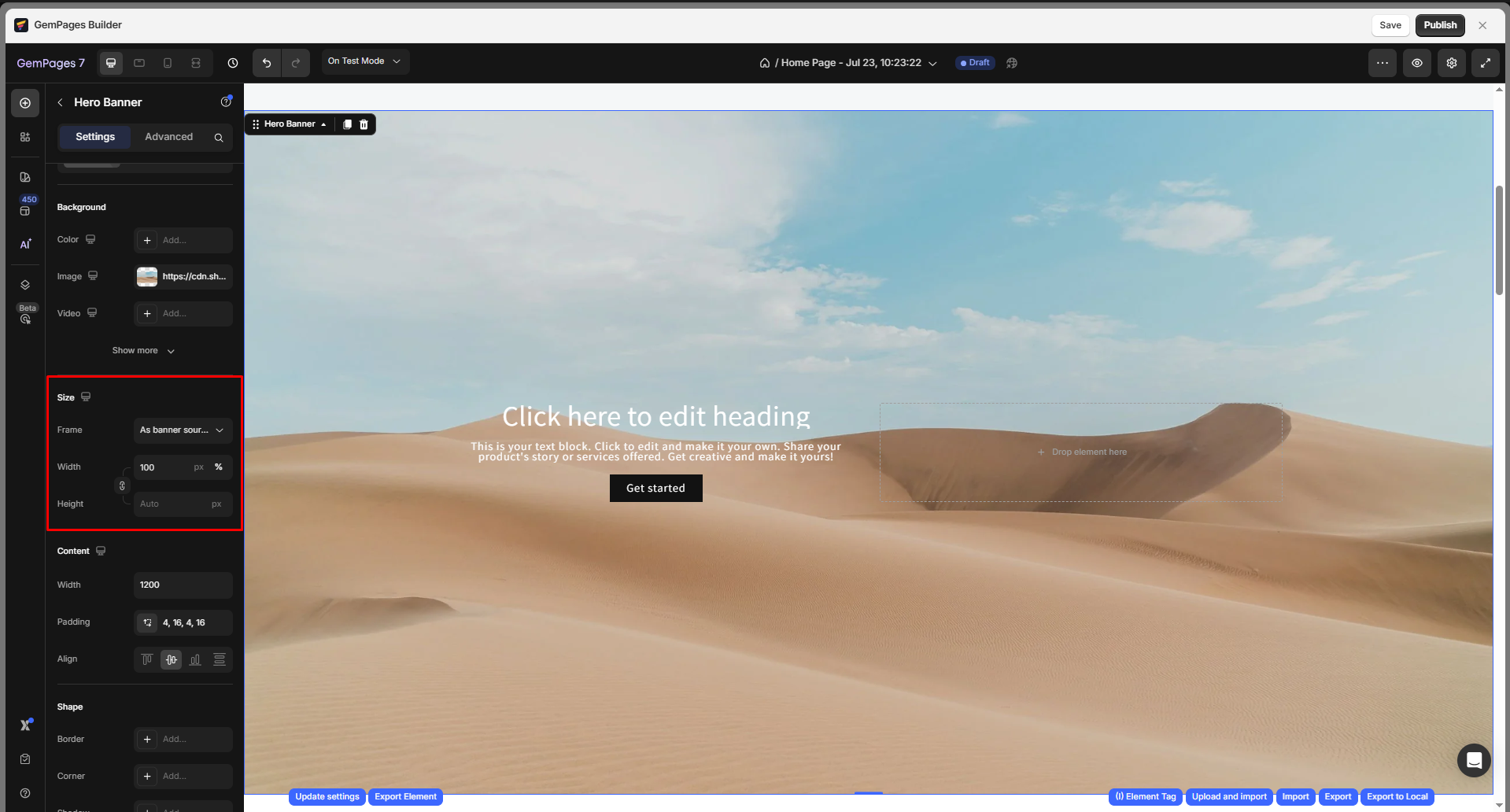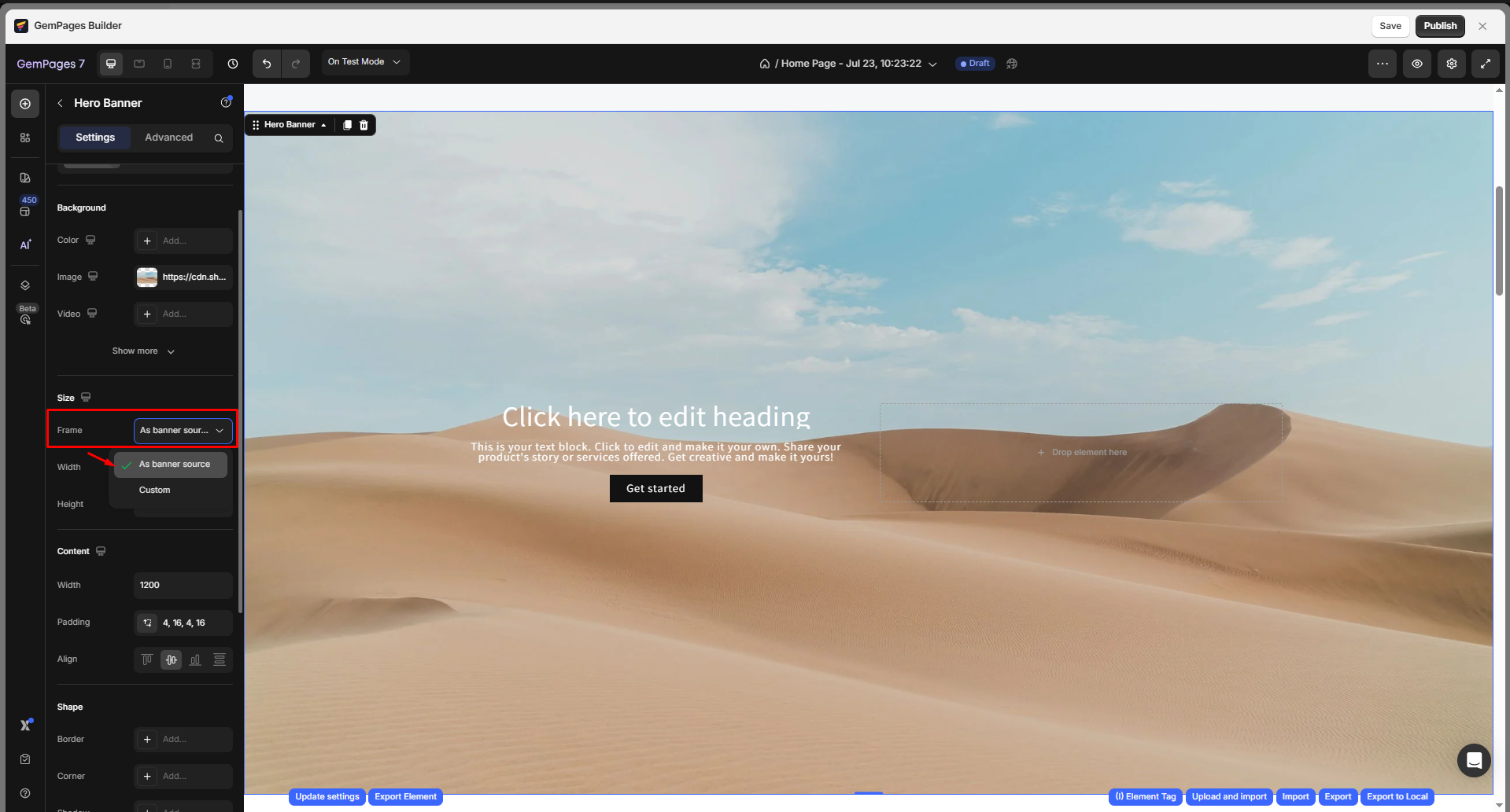 From the Frame dropdown, you have two options to modify the Hero Banner size: