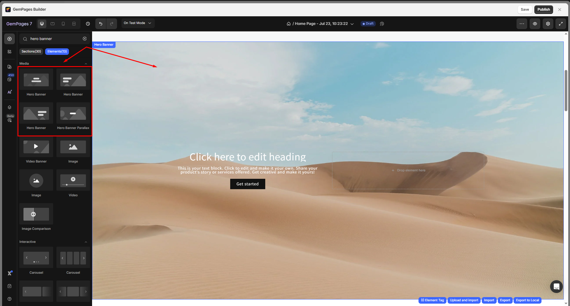 - If you haven’t added a Hero Banner to your page yet, drag and drop one from the left sidebar. Refer to this guide on how to insert a Hero Banner.
