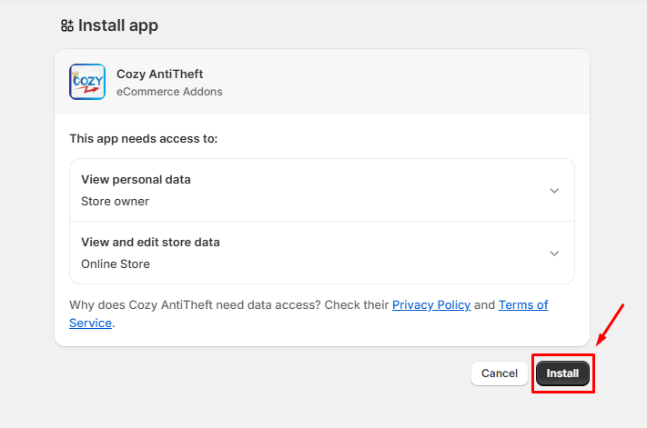 Step 1: Install your preferred app from the Shopify App Store. For example, we’ll use the Cozy Anti-Theft: