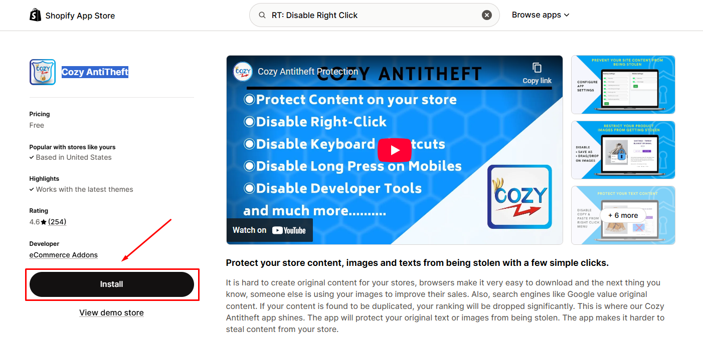 Using a third-party app is the most practical and reliable way to protect your store content without dealing with code. These apps offer built-in protections and are maintained to be compatible with modern browsers/themes.