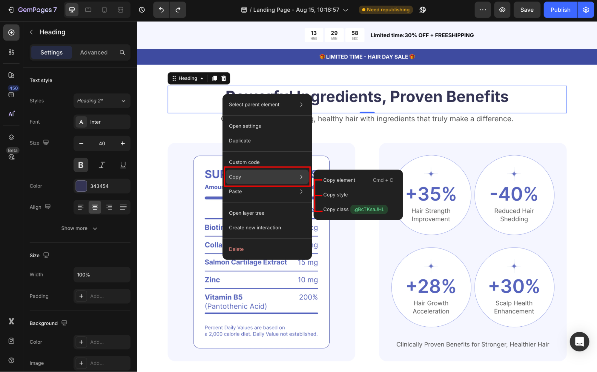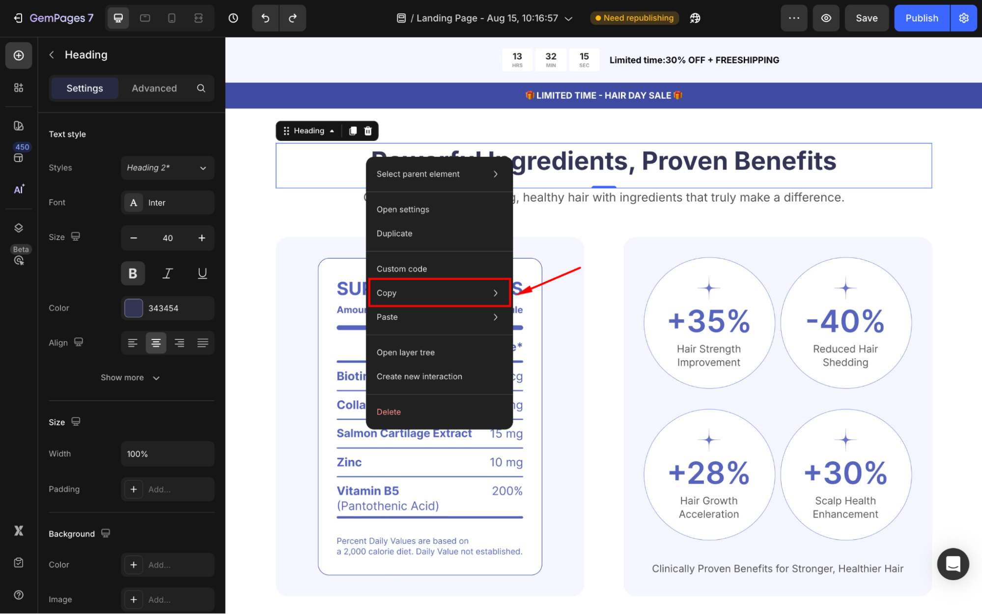 Step 2: Once you are located in the GemPages Editor, right-click on the text element and hit the Copy option from the dropdown.