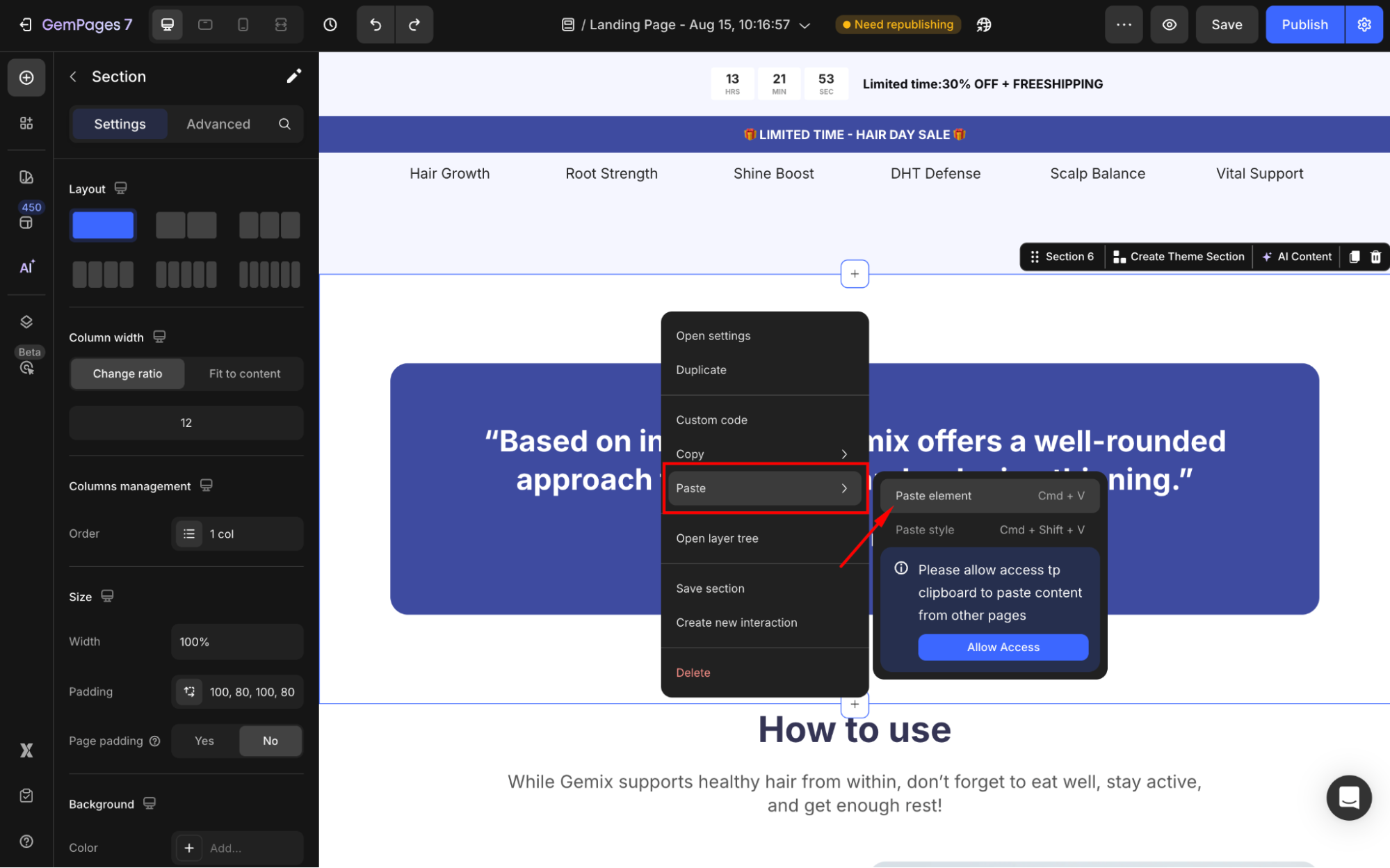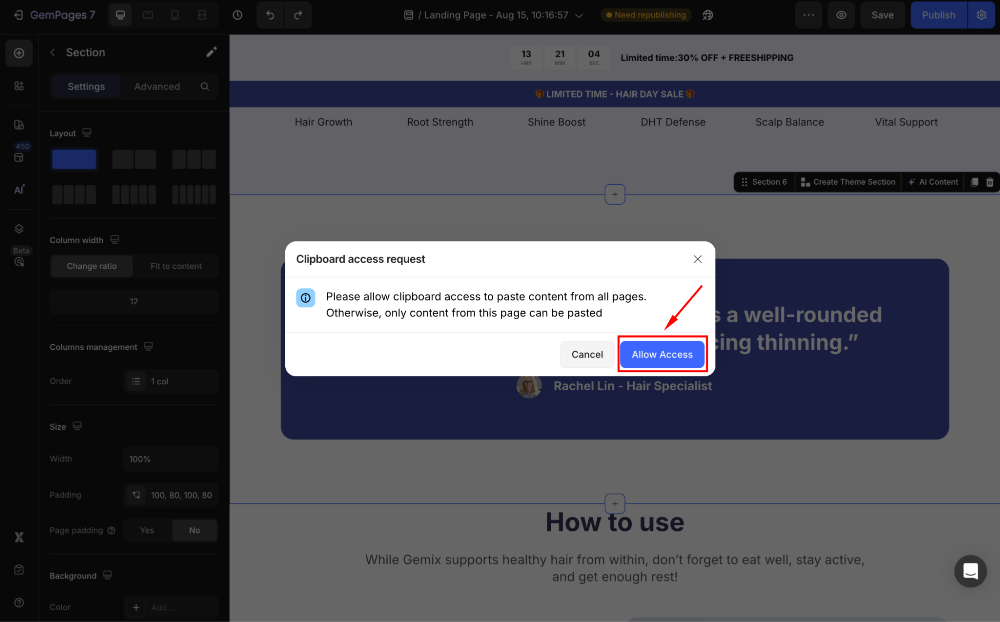 Step 3: The pop-up request will appear. Hit Allow Access to allow clipboard access to paste content from all of your pages built with GemPages.