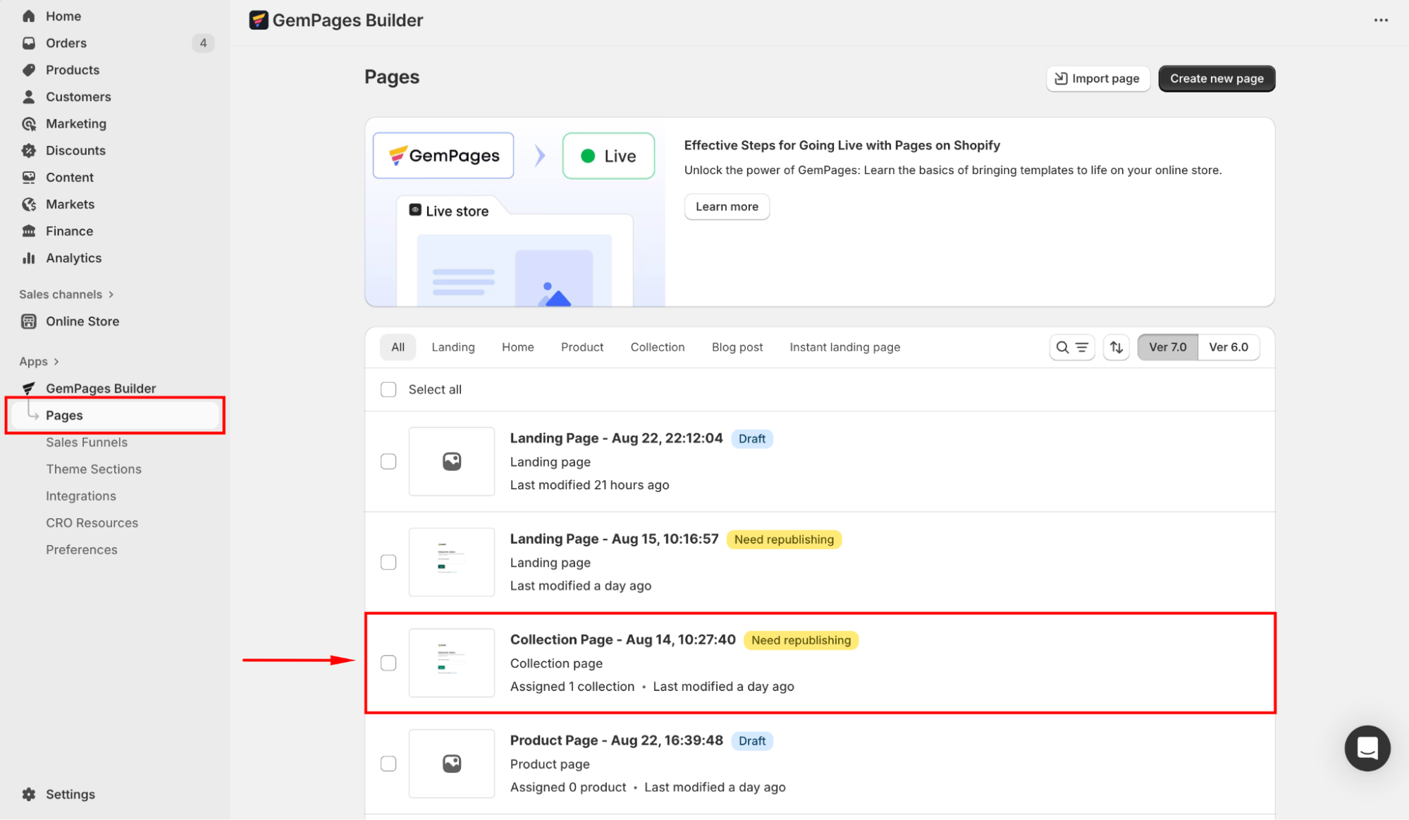 - From your Shopify admin, navigate to the GemPages Builder app under the Apps section.