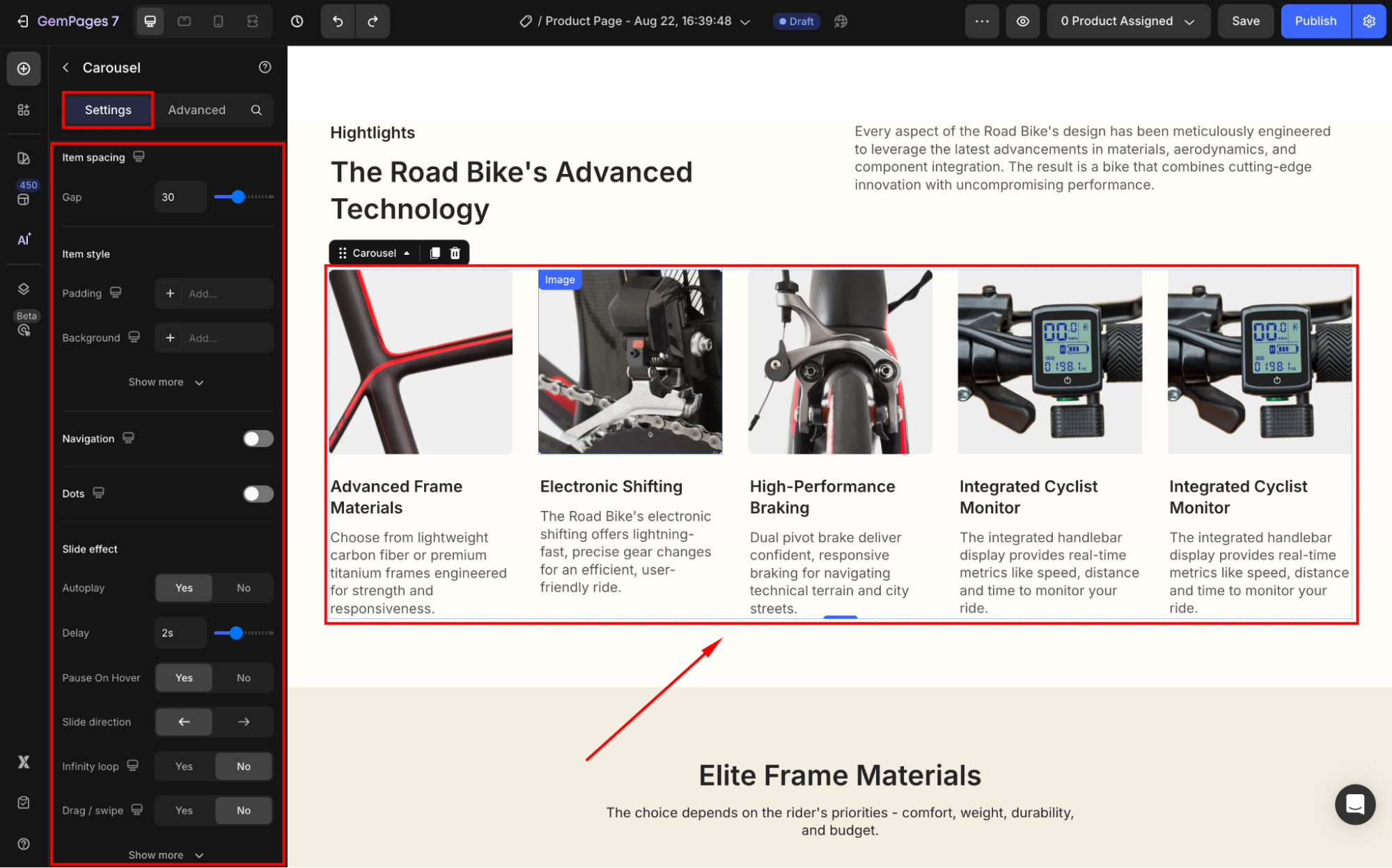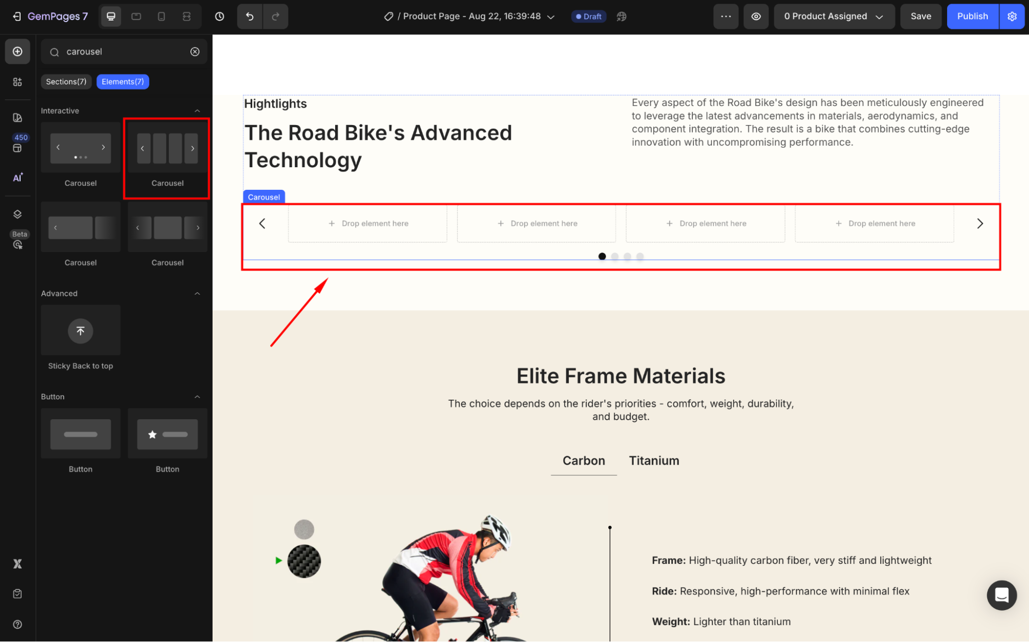 The Carousel element offers a more dynamic and space-saving option for displaying products. Here’s how to set it up: