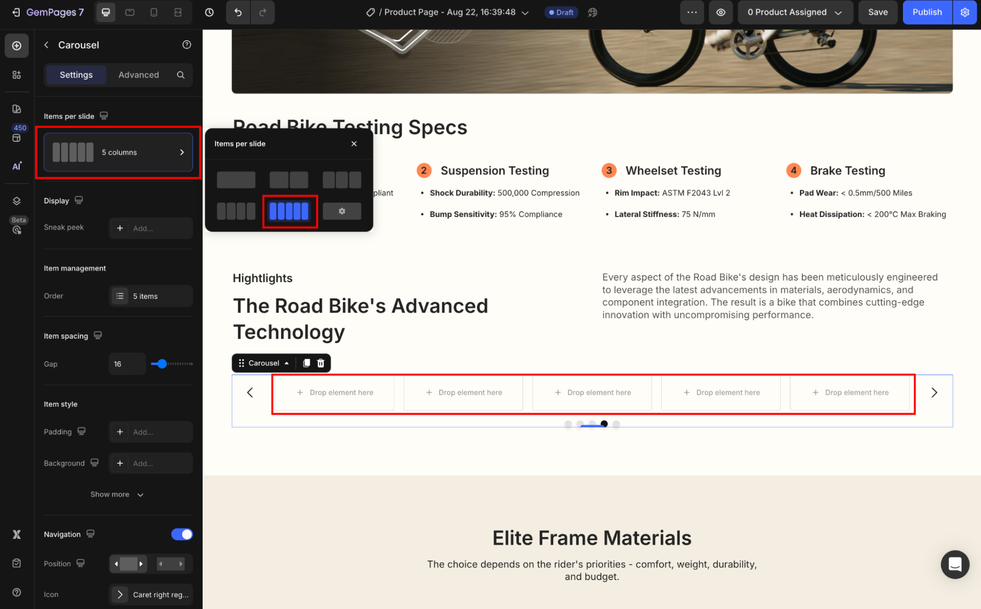 In GemPages v7, it’s easy to design a 5-column grid layout on your page using the Row Element or the Carousel Element.