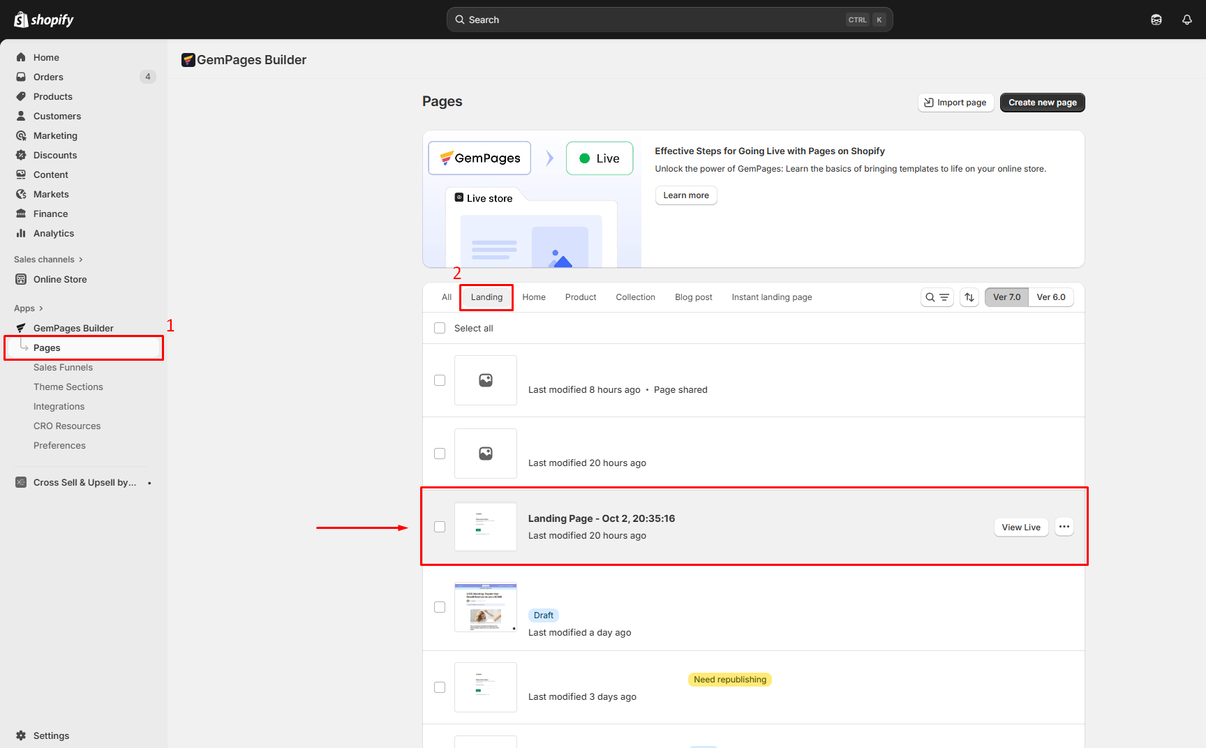 - From your Shopify admin, open the GemPages Builder app under the Apps section.
