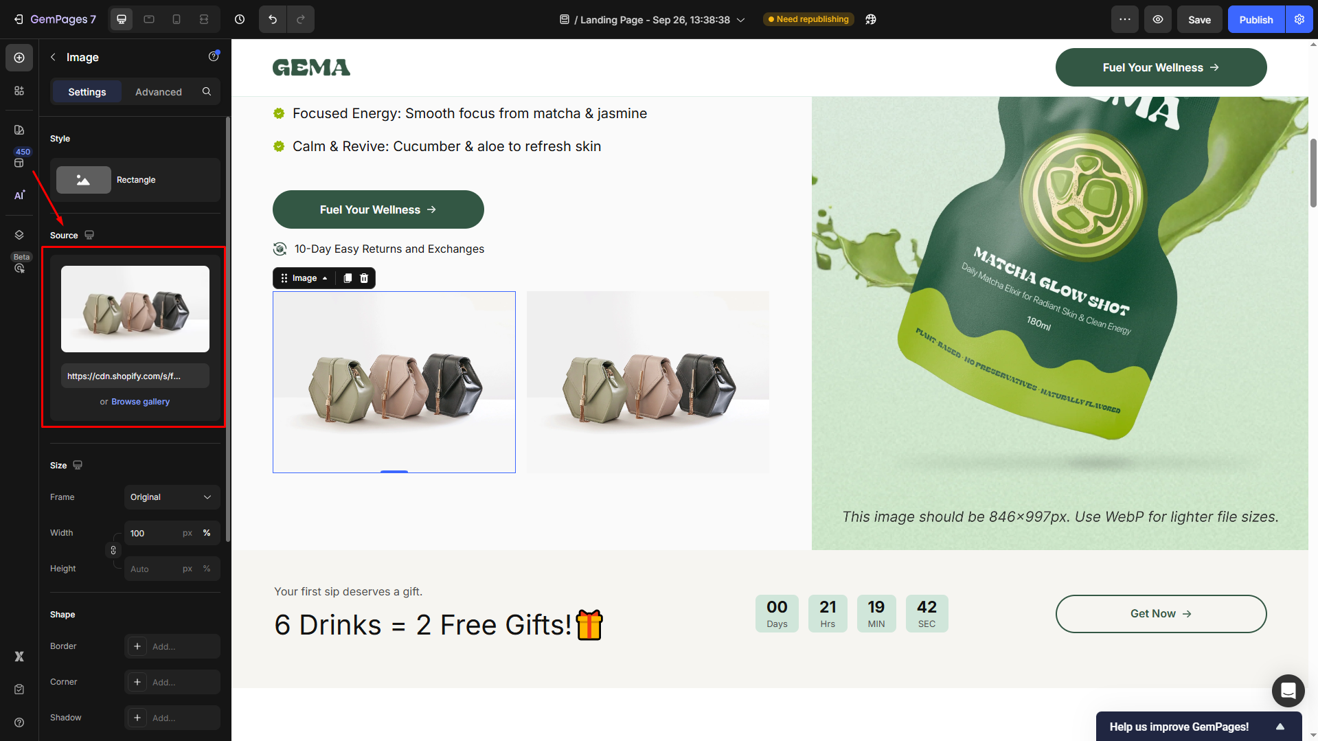 - Then, click the image to open its settings panel and locate the Source section.