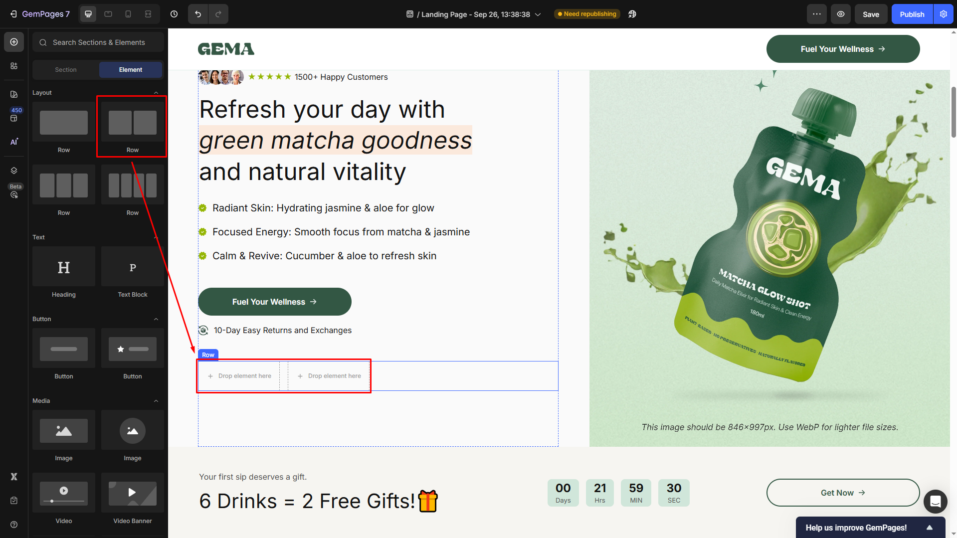 To design a Social Sharing section in GemPages v7, we recommend using the Row Element and Image Element.