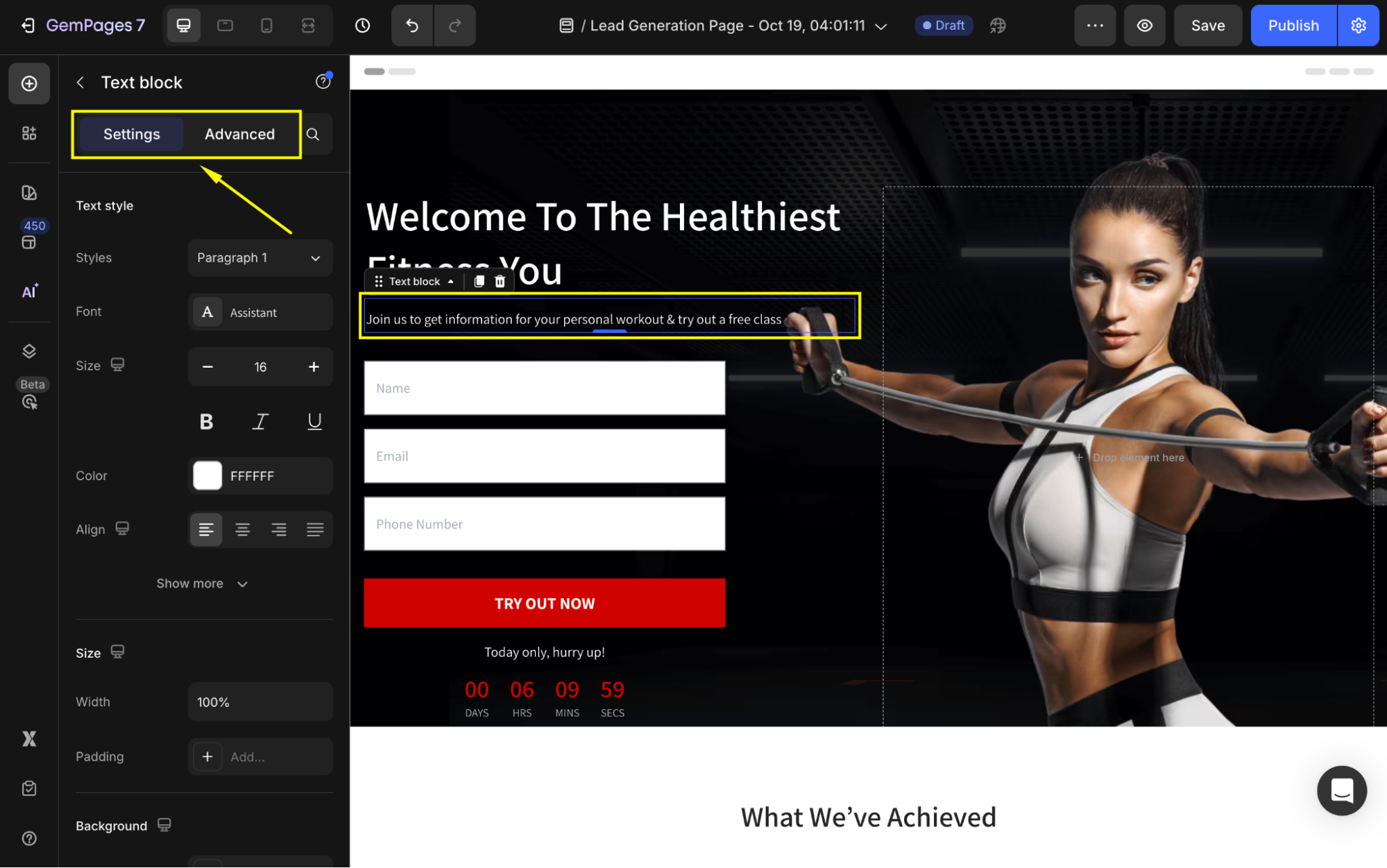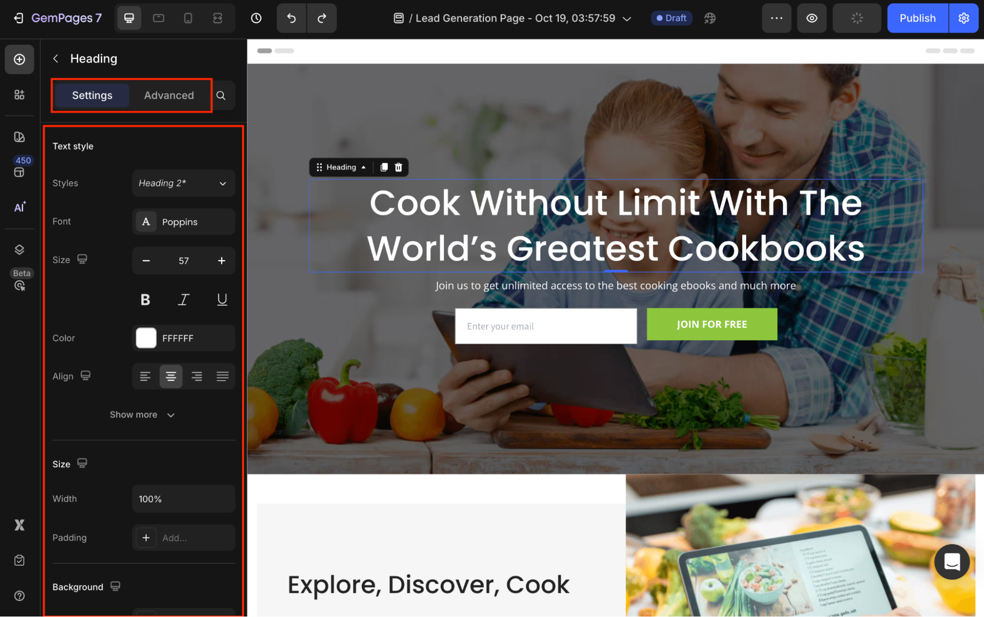 Step 4: Use the Settings and Advanced tabs in the left sidebar to personalize the appearance, alignment, and functionality of each element.