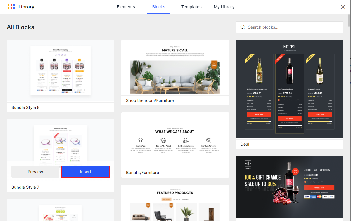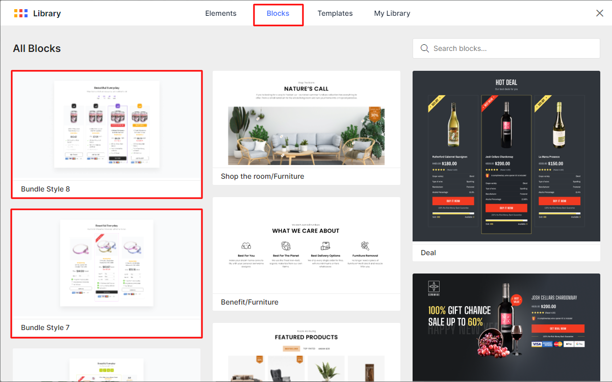 Step 2: Under the Blocks tab, look for your preferred bundle template using the search bar.