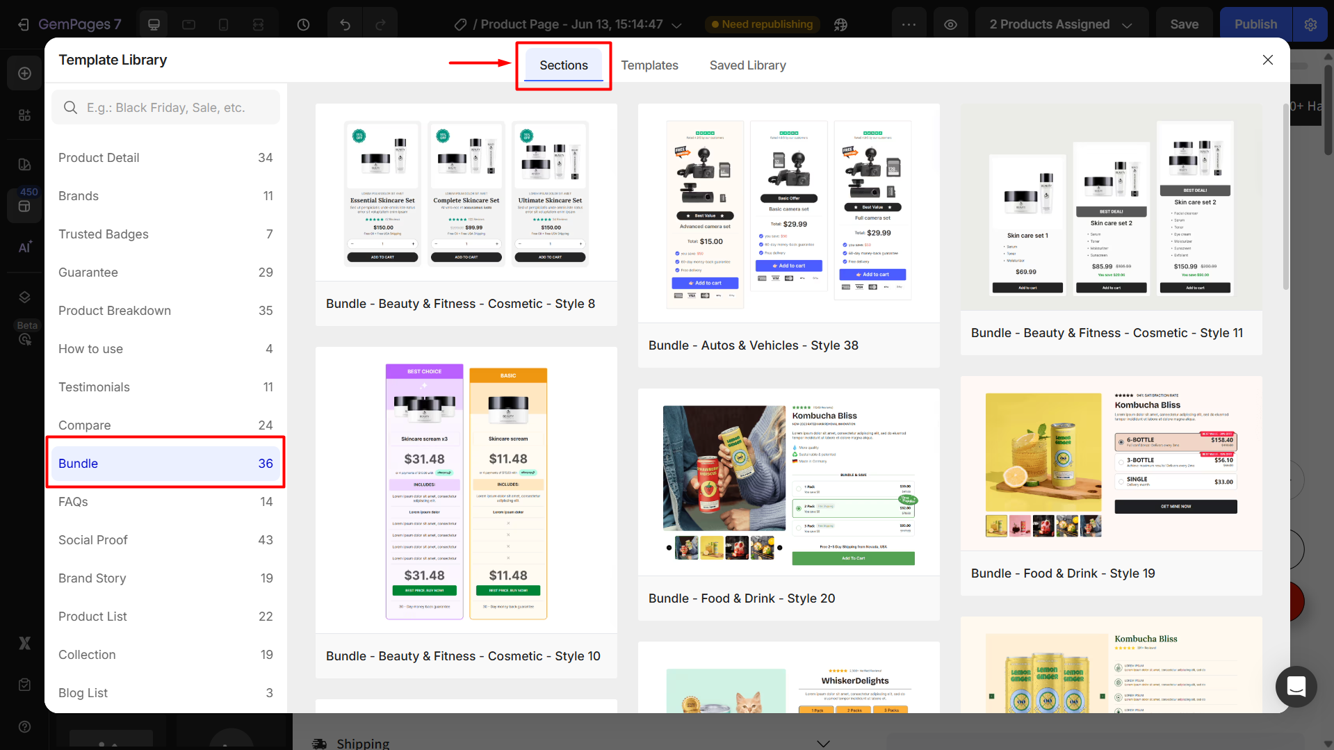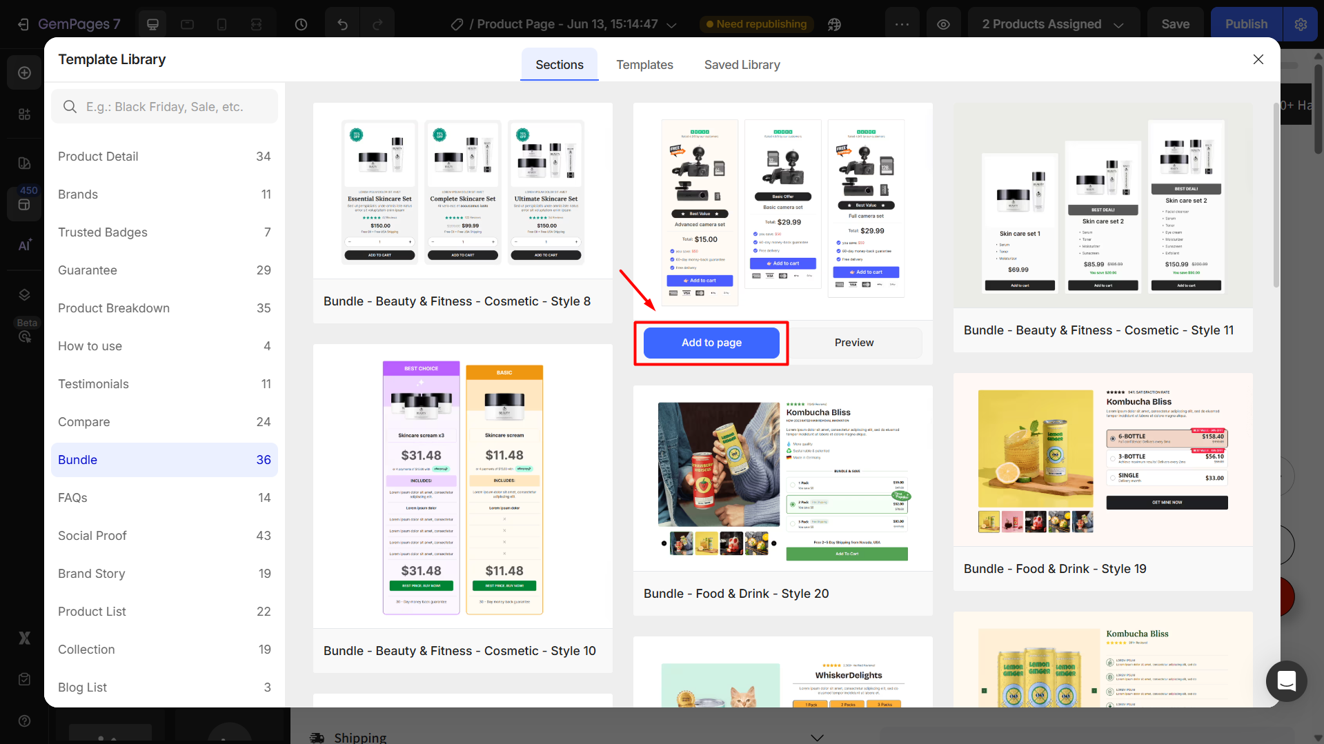 You can display bundles in GemPages by adding a bundle section or block through the editor’s Template Library (for both v6 and v7 versions), then linking your Shopify product listings to each product module.
