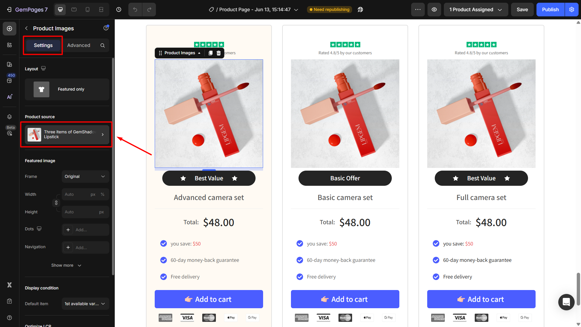 To select the product for each bundle, click on the product image to open its settings. Then click the product box under the Product source section in the Settings tab. Then, manage the product in the Product element.